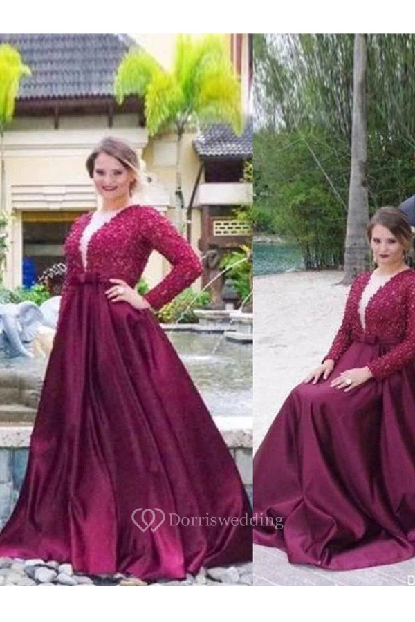 A-Line Satin Lace V-neck Long Sleeve Zipper Low-V Back Dress