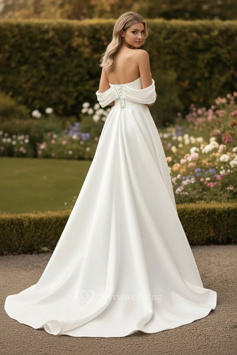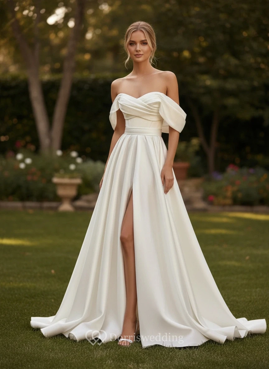 A-line Satin Off-the-Shoulder High-Slit Wedding Dress