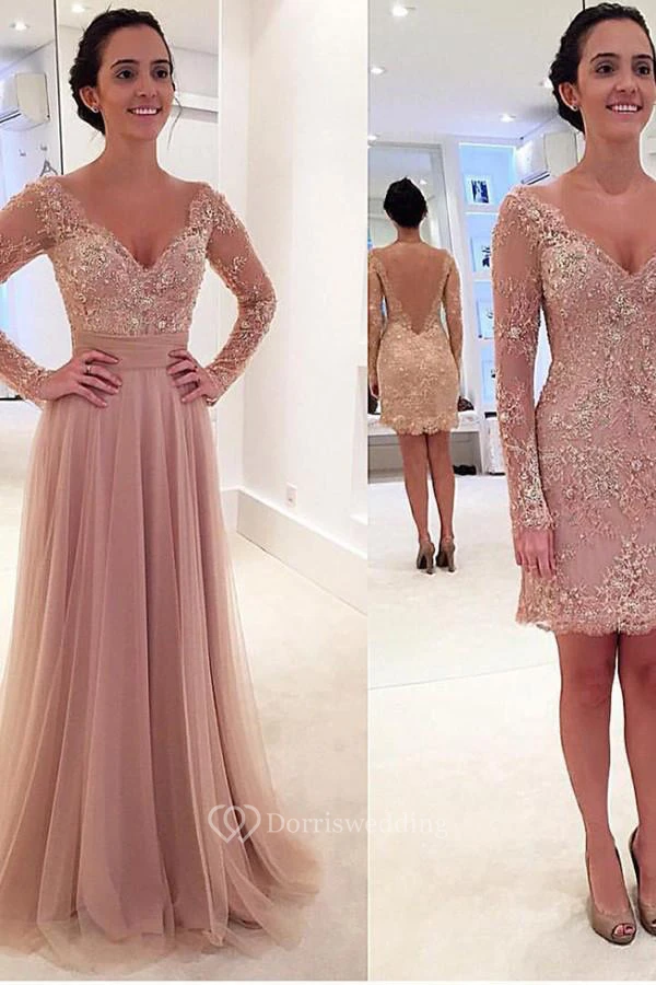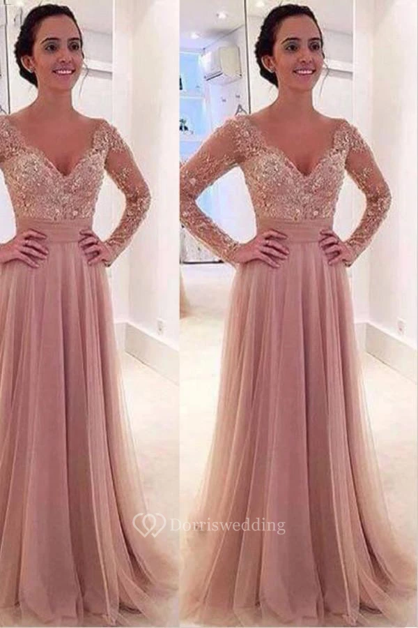 A-Line Satin V-neck Long Sleeve Illusion Low-V Back Dress