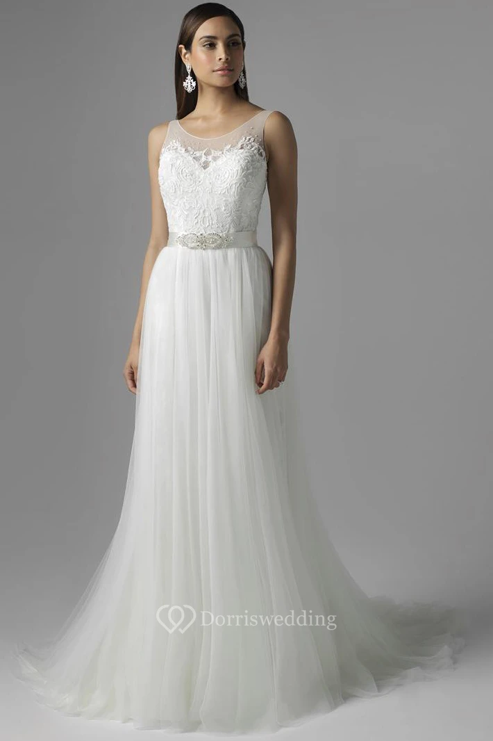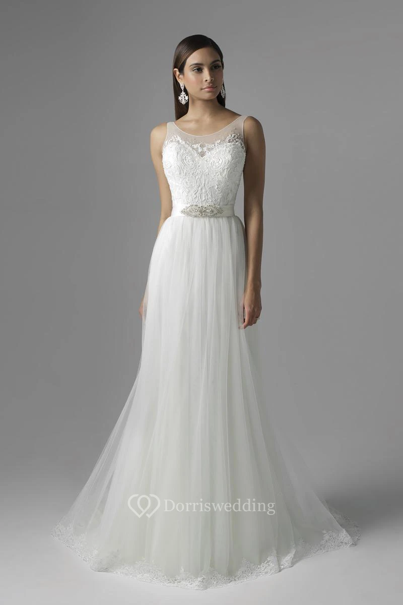 A-Line Scoop Appliqued Sleeveless Floor-Length Tulle Wedding Dress With Waist Jewellery And Pleats