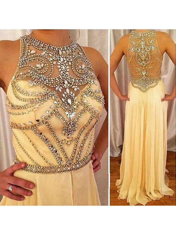 A-line Scoop Chiffon Sleeveless Crystal Sweep Train Dresses