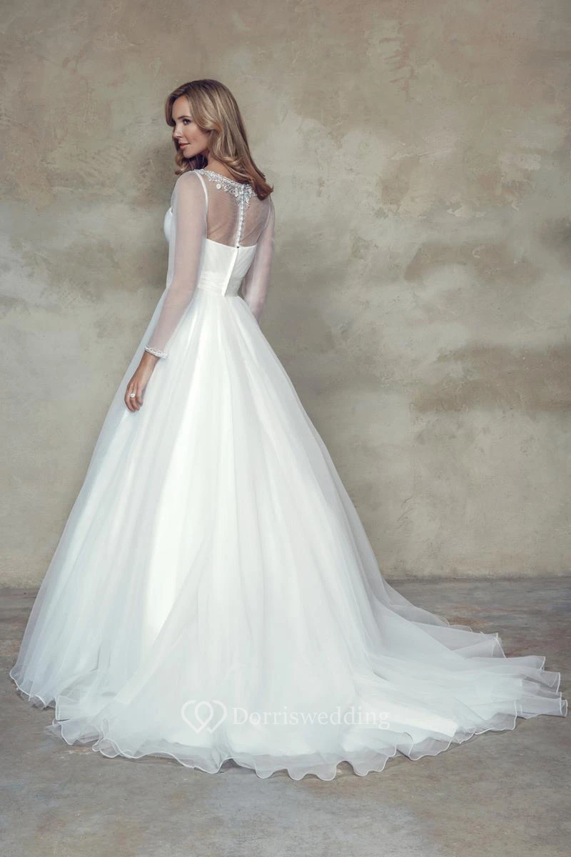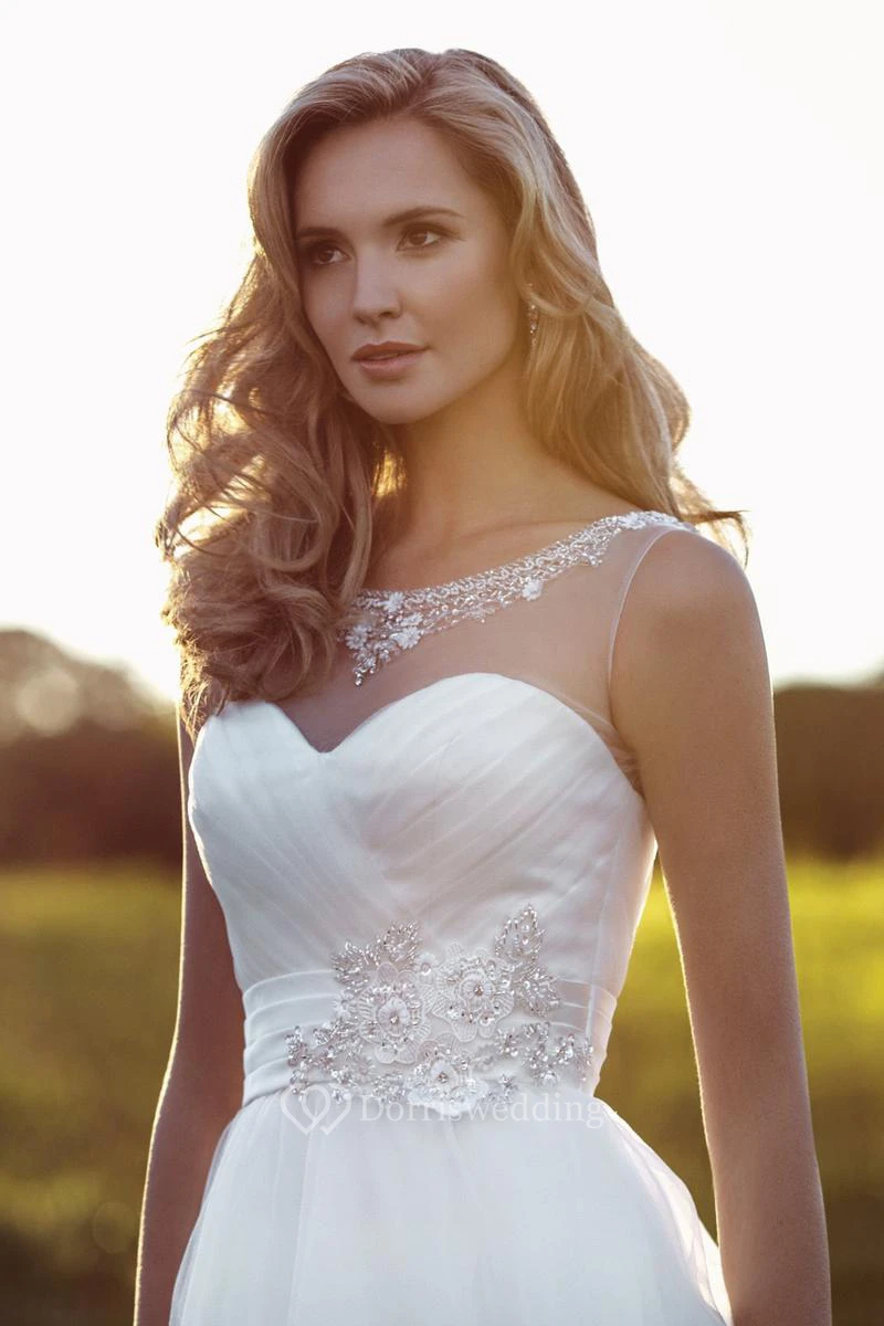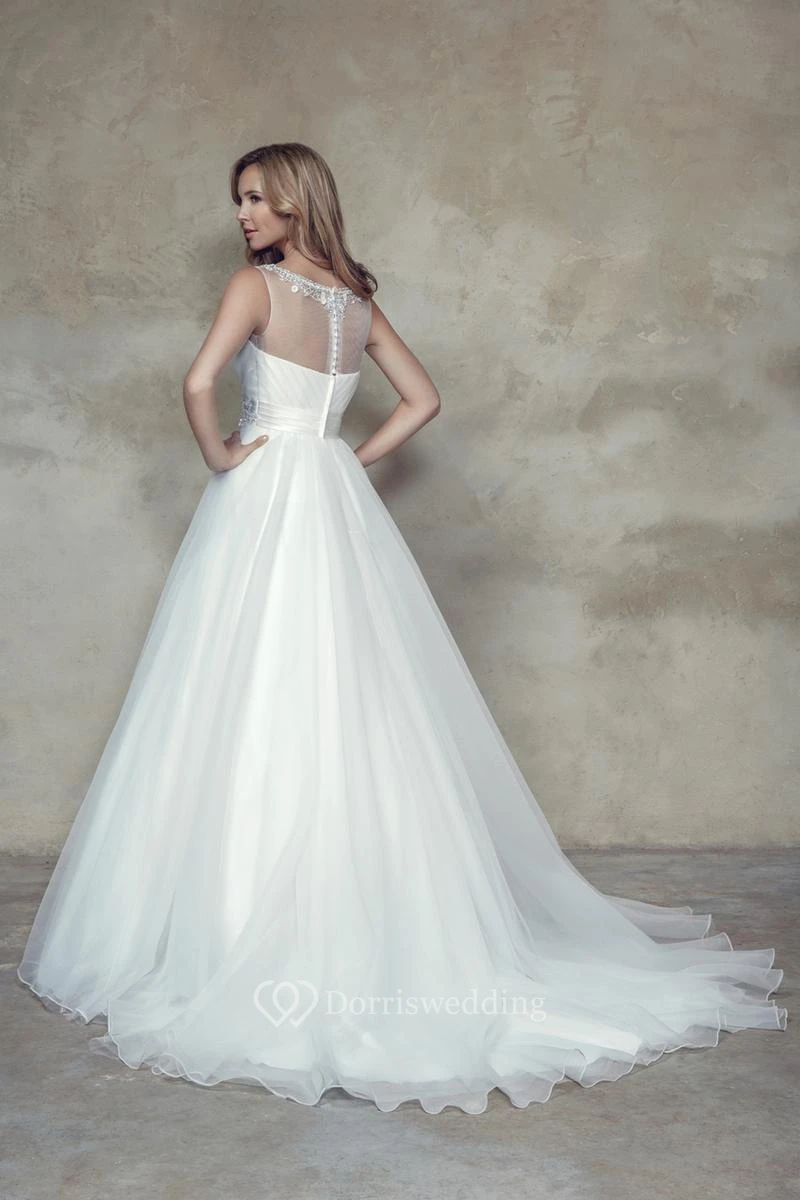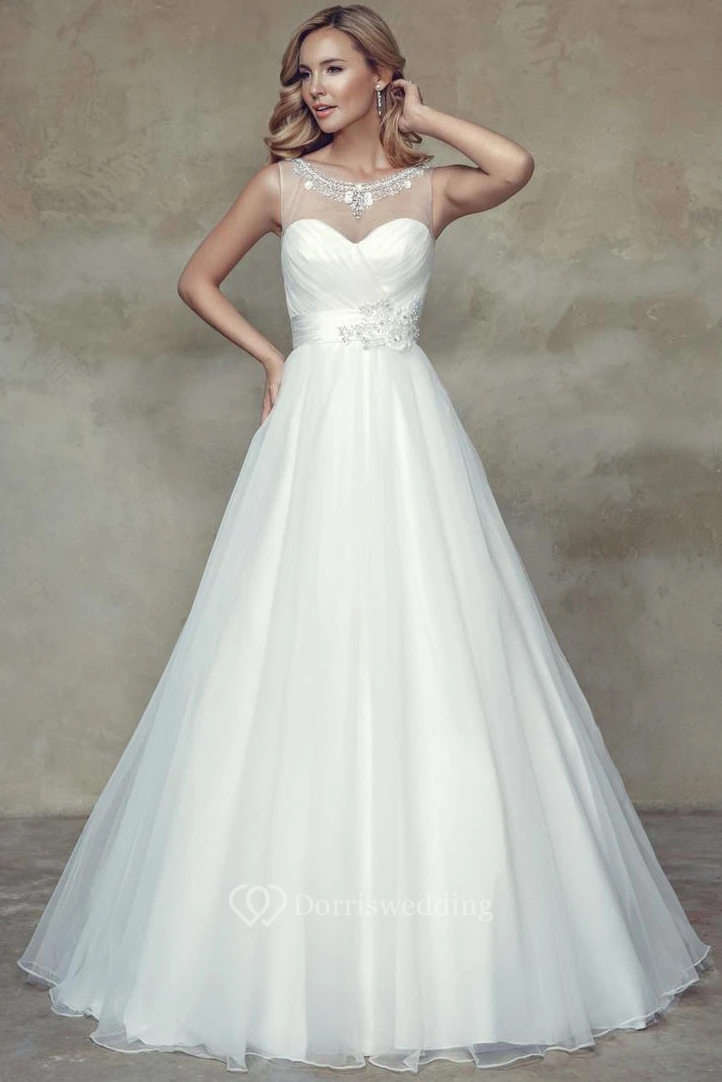 A-Line Scoop Criss-Cross Sleeveless Maxi Tulle & Satin Wedding Dress Styles With Beading And Flower