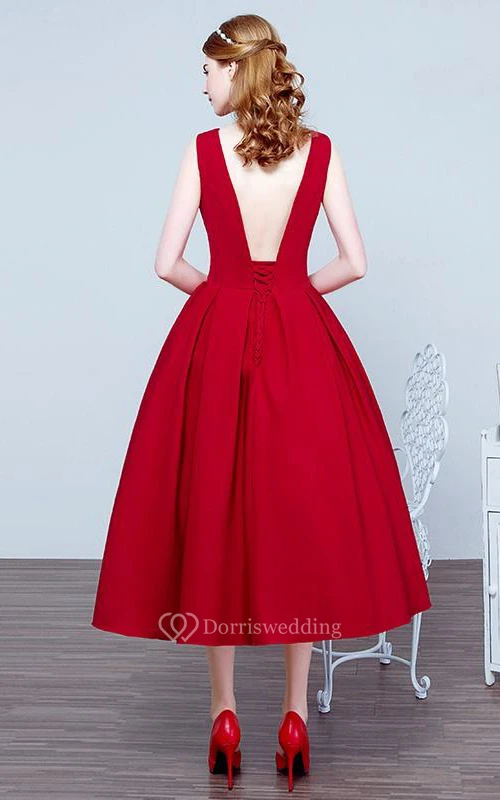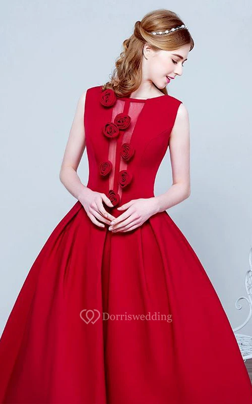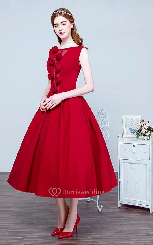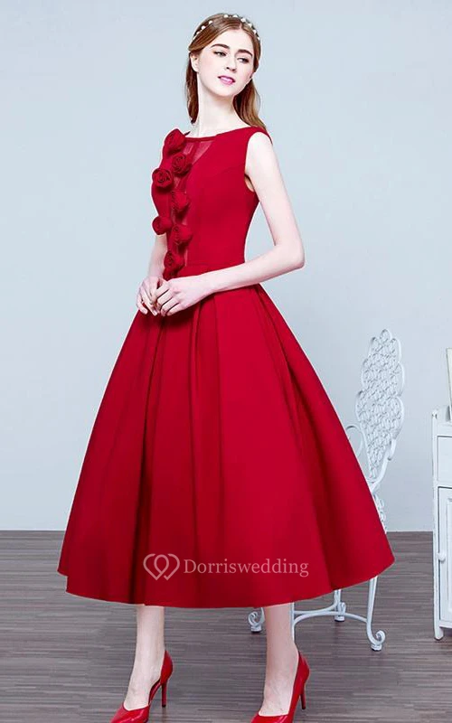 A-Line Scoop Flowers Tea-Length Prom Dress