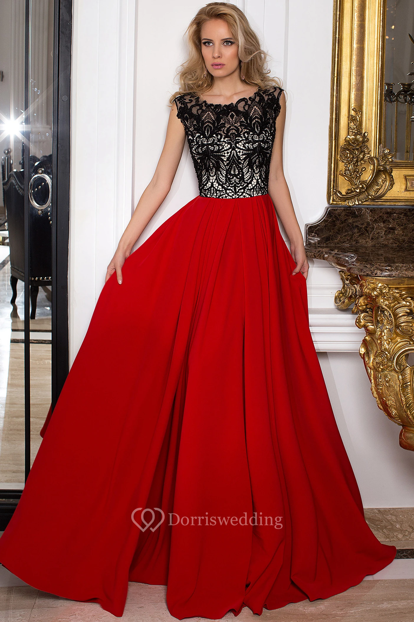 A-Line Scoop Lace Floor-Length Sleeveless Chiffon Prom Dress With Pleats