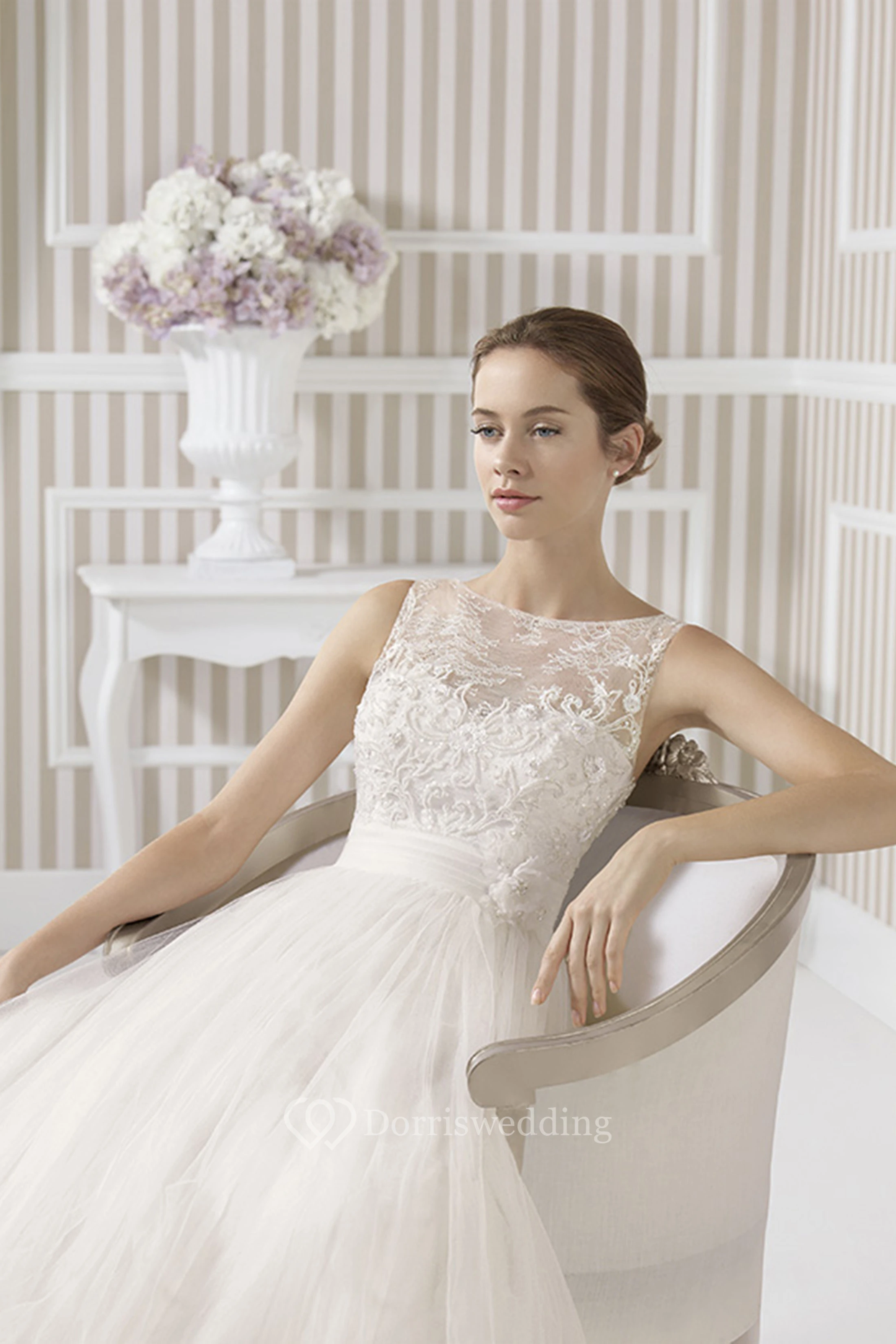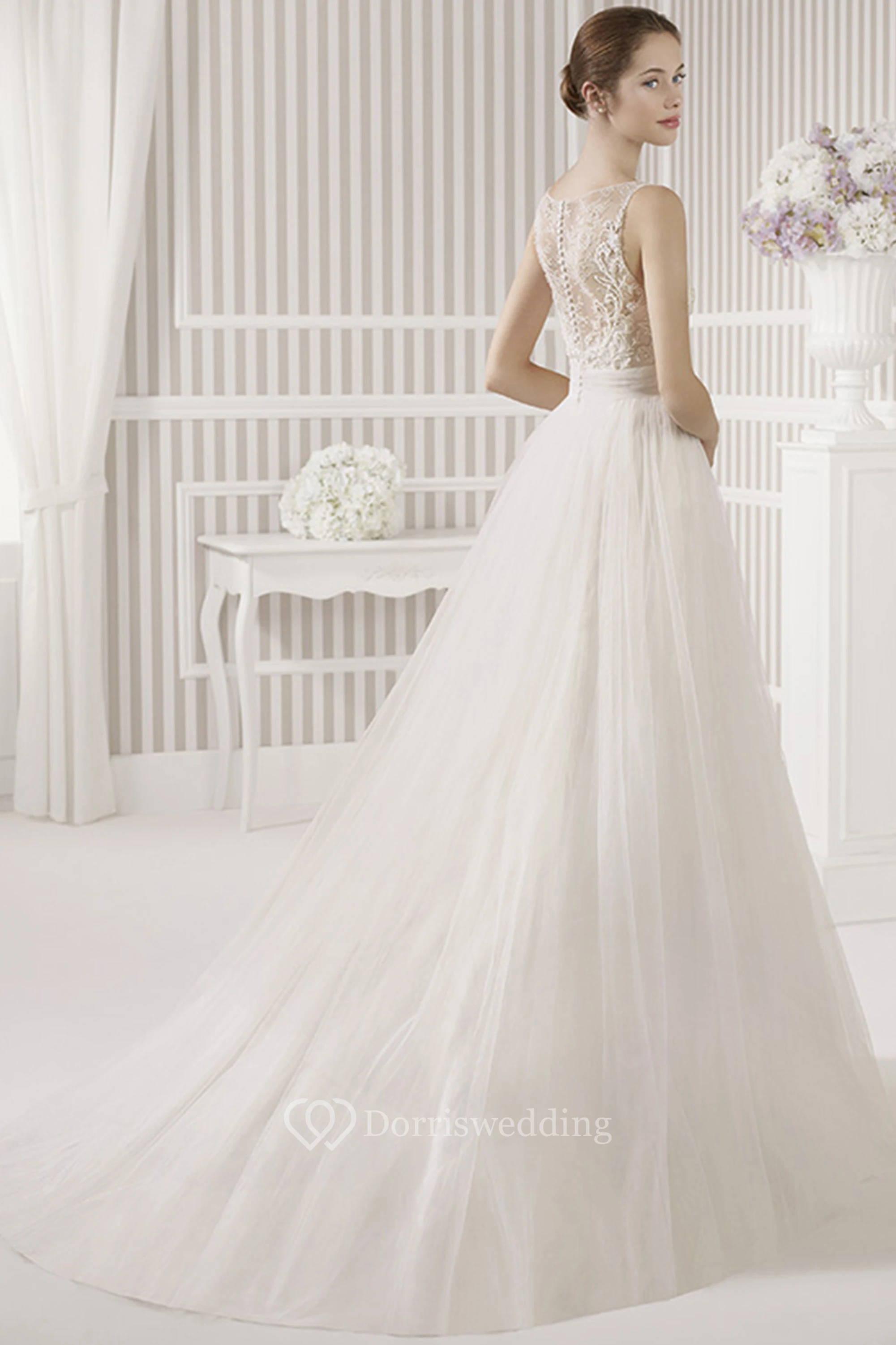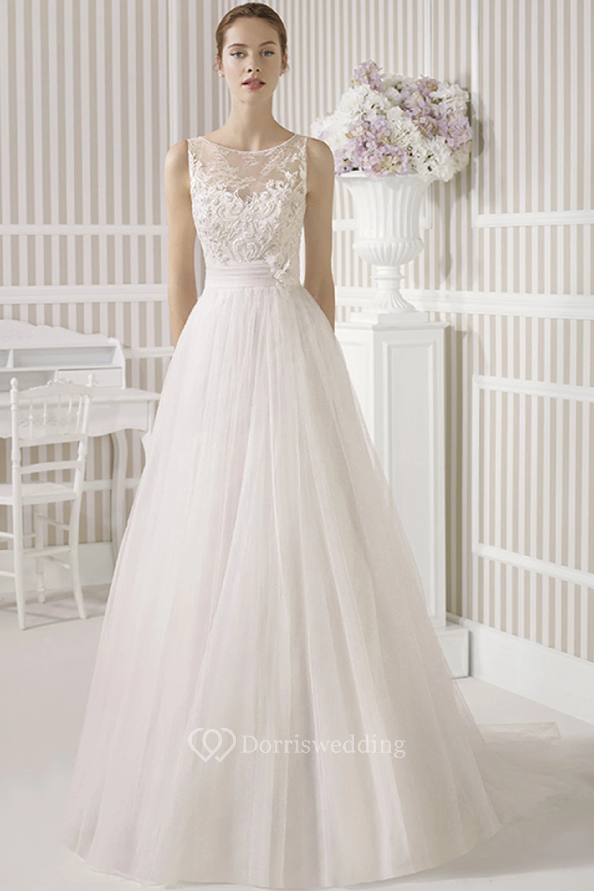 A-Line Scoop Long Lace Sleeveless Satin&Tulle Wedding Dress With Flower And Illusion Back