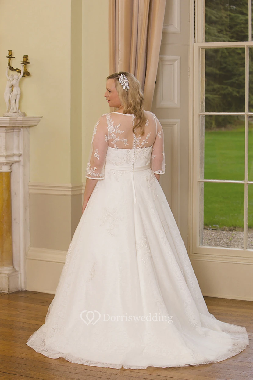 A-Line Scoop-Neck 3-4-Sleeve Lace Plus Size Wedding Dress Styles With Illusion