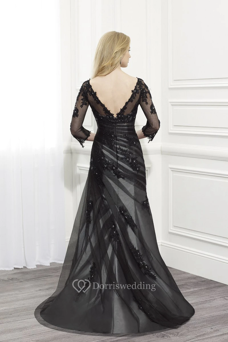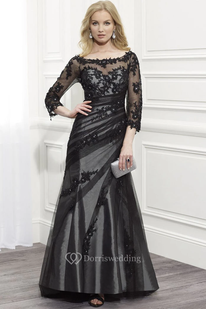 A-Line Scoop-Neck Appliqued Floor-Length 3-4-Sleeve Tulle&Satin Formal Dress With Beading And Side Draping