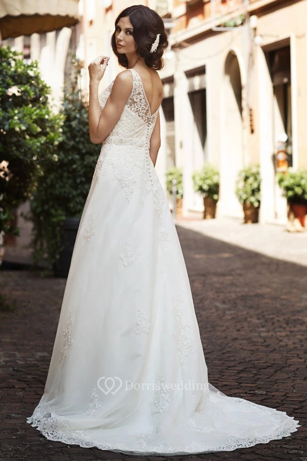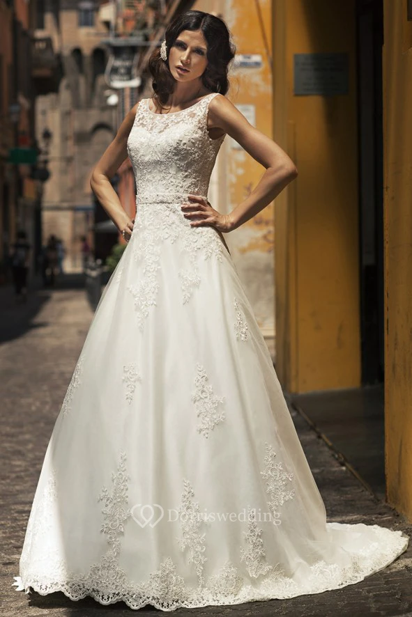 A-Line Scoop-Neck Appliqued Sleeveless Floor-Length Satin&Lace Wedding Dress With Beading