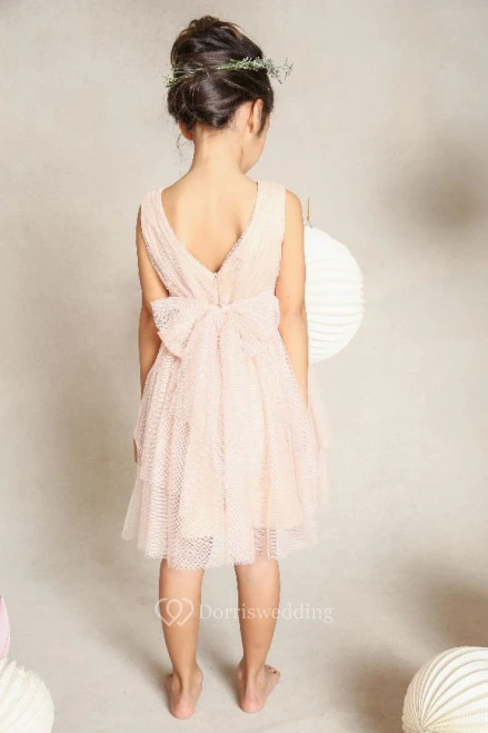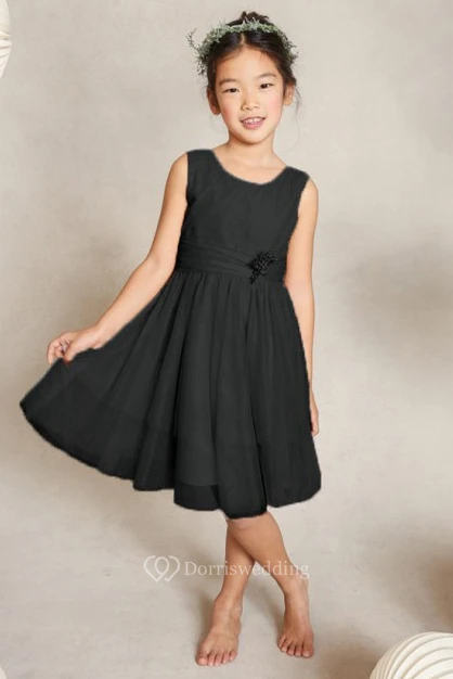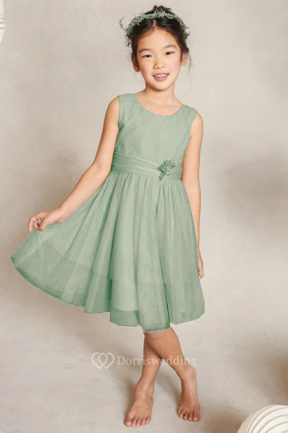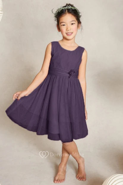A-Line Scoop-Neck Broach Knee-Length Sleeveless Tulle Flower Girl Dress With Bow And Pleats
