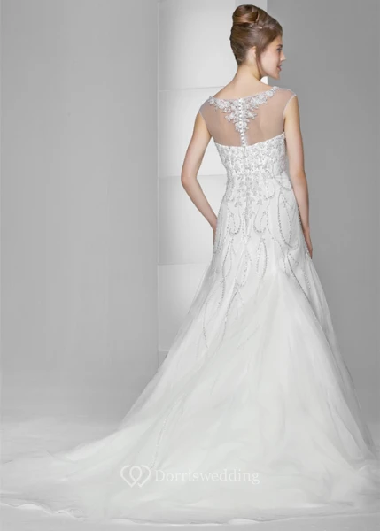 A-Line Scoop-Neck Cap-Sleeve Beaded Long Tulle Wedding Dress