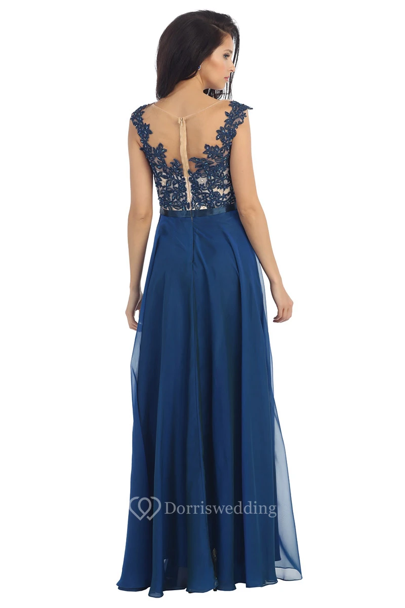 A-Line Scoop-Neck Cap-Sleeve Chiffon Illusion Dress With Appliques And Pleats