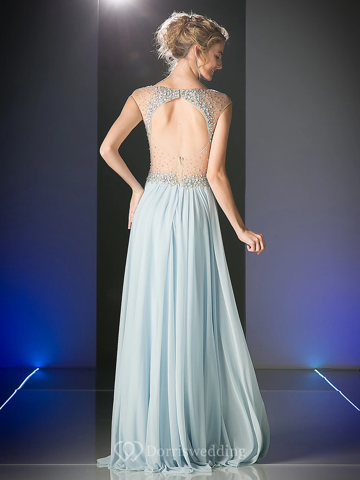 A-Line Scoop-Neck Cap-Sleeve Chiffon Keyhole Dress With Beading And Pleats