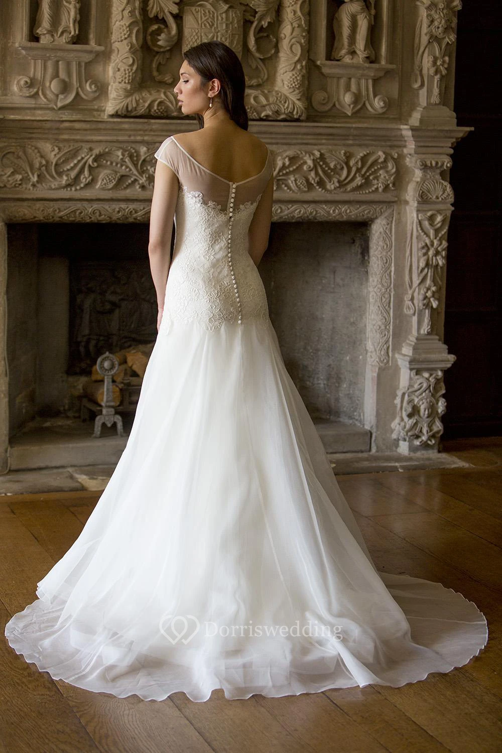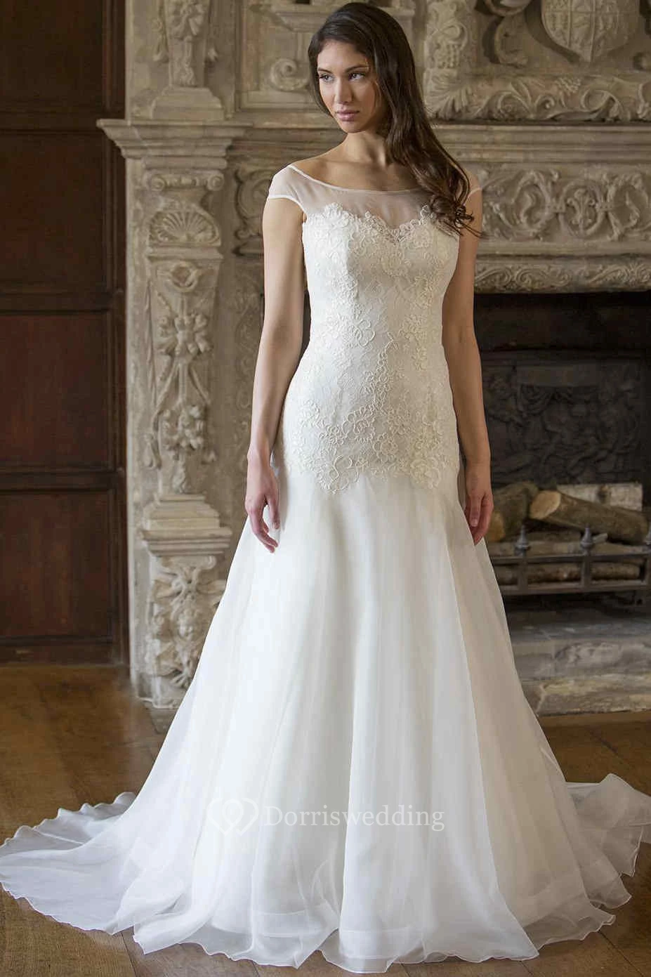 A-Line Scoop-Neck Cap-Sleeve Floor-Length Lace Wedding Dress With V Back