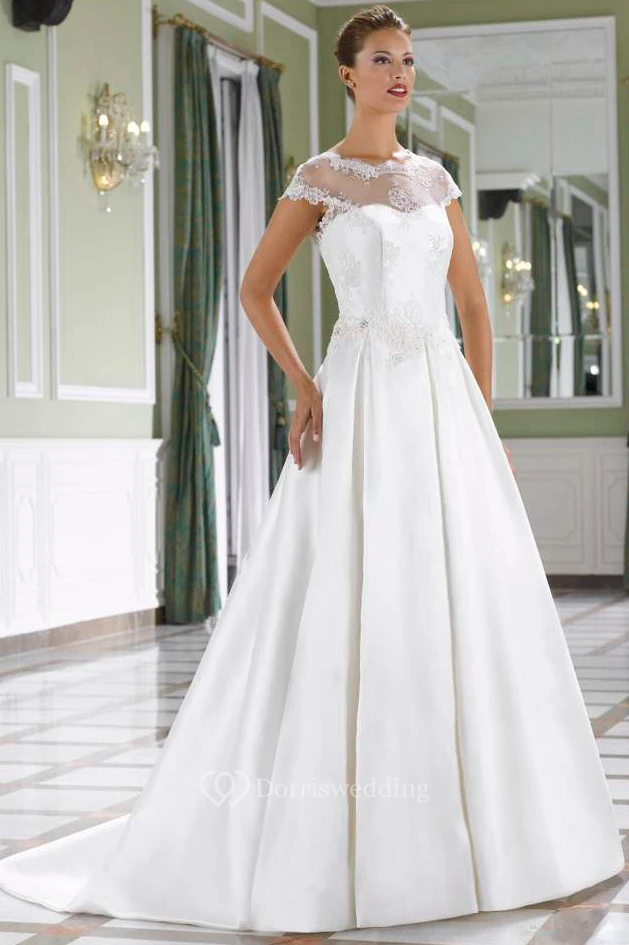 A-Line Scoop-Neck Cap-Sleeve Floor-Length Satin Wedding Dress With Appliques And V Back