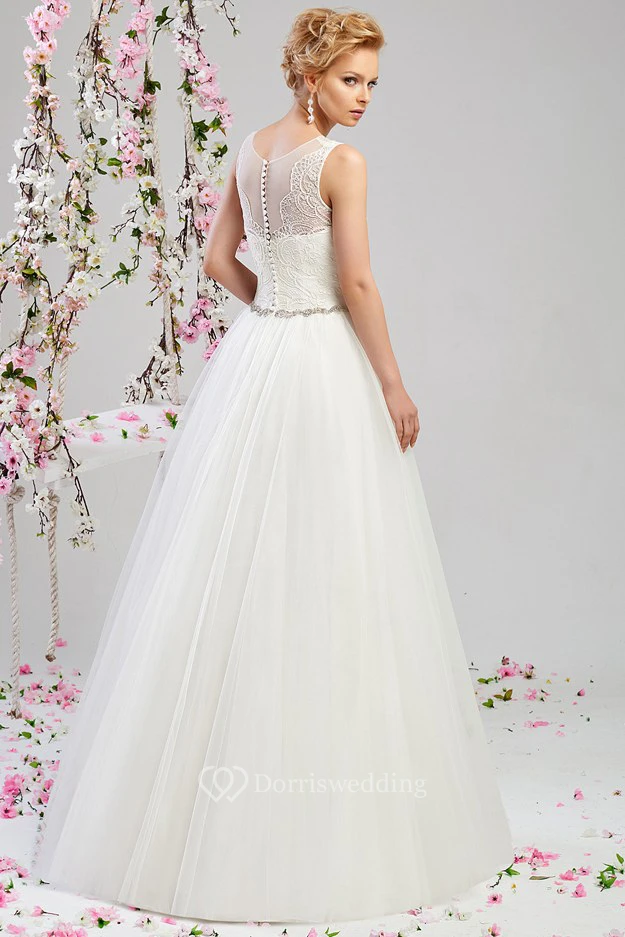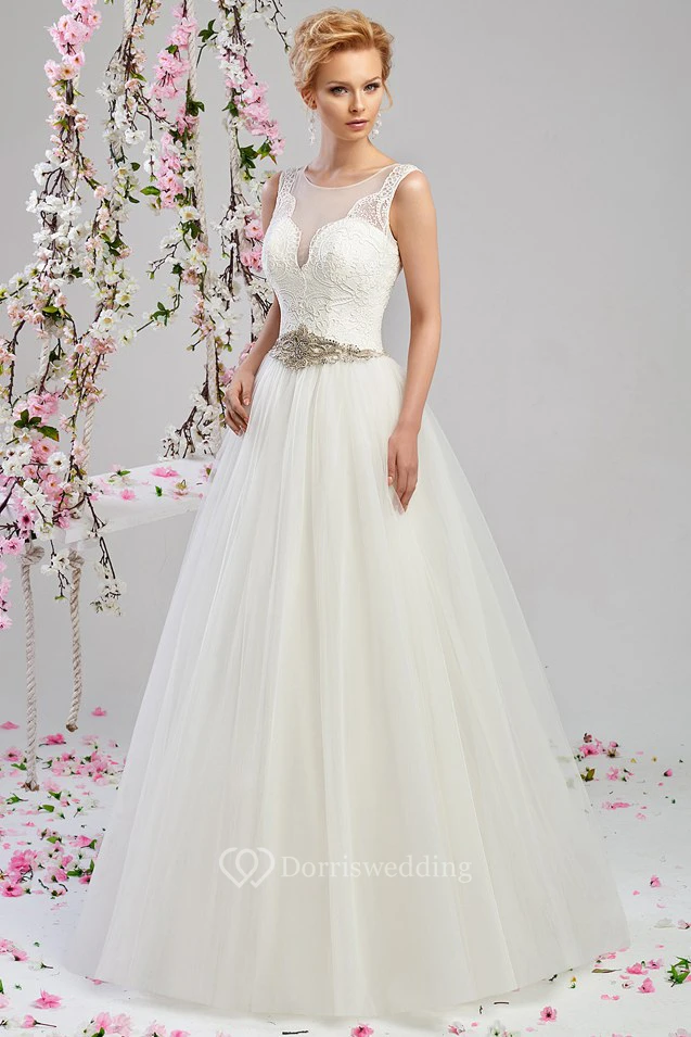 A-Line Scoop-Neck Floor-Length Sleeveless Appliqued Tulle&Satin Wedding Dress With Waist Jewellery