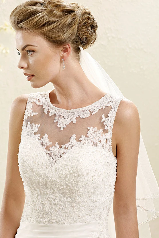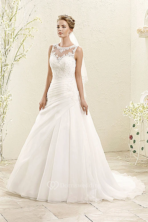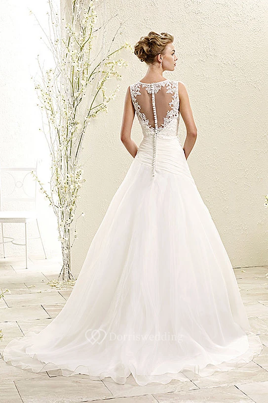 A-Line Scoop-Neck Floor-Length Sleeveless Appliqued Wedding Dress With Side Draping
