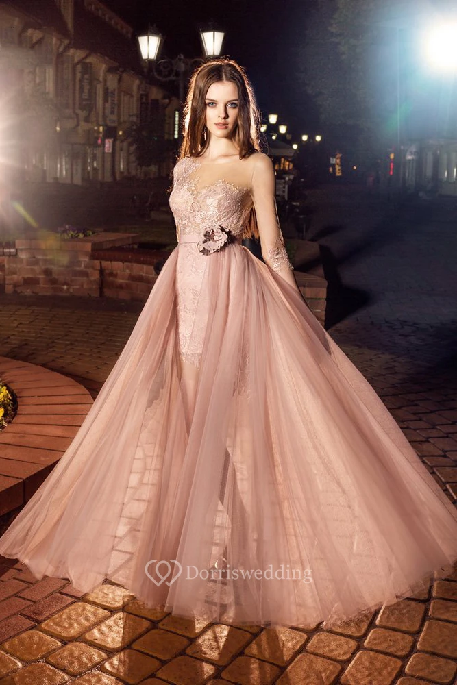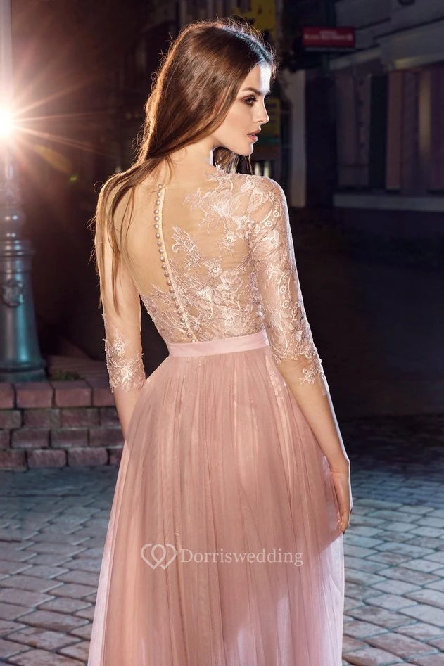 A-Line Scoop-Neck Half Sleeve Lace Tulle Illusion Dress With Appliques And Flower