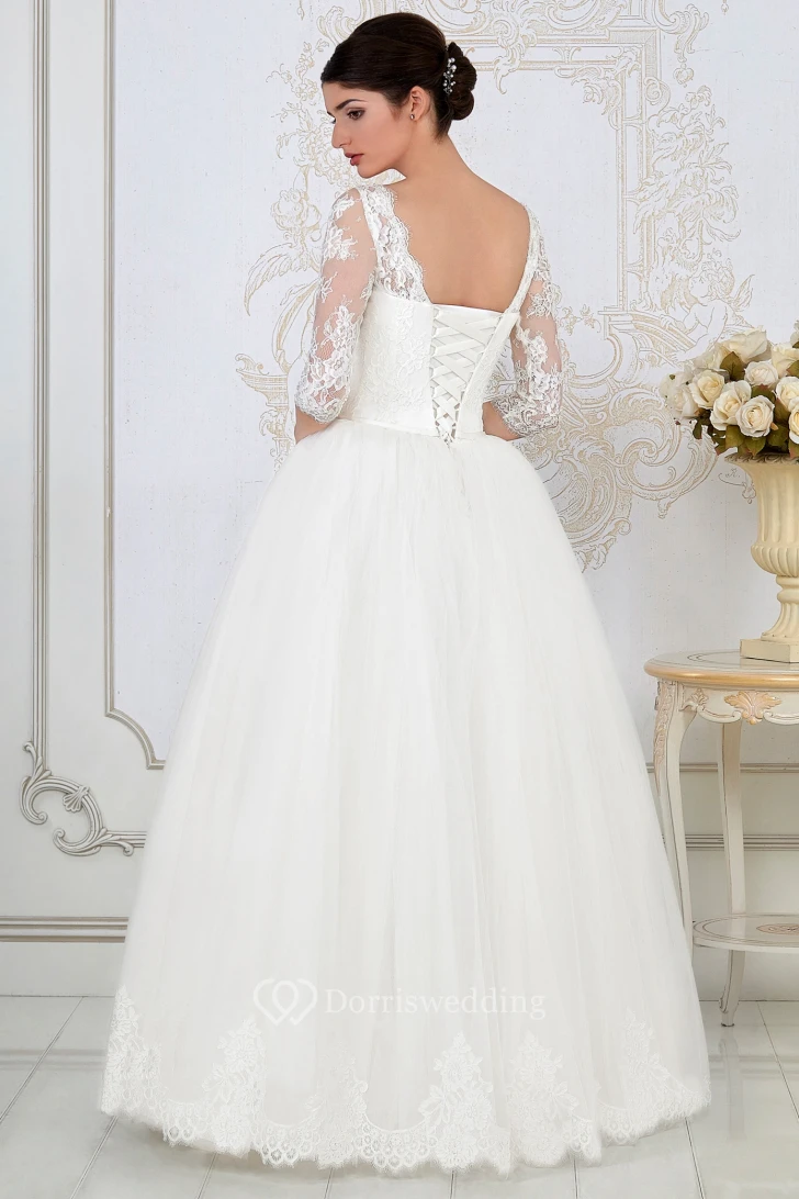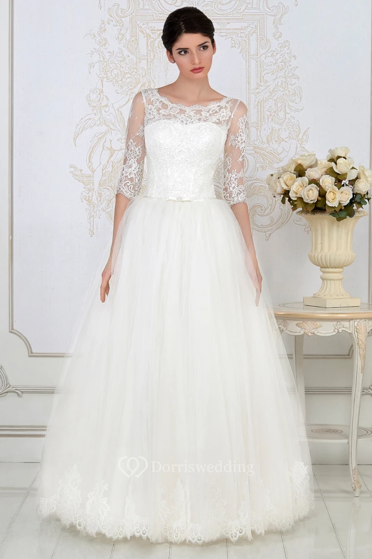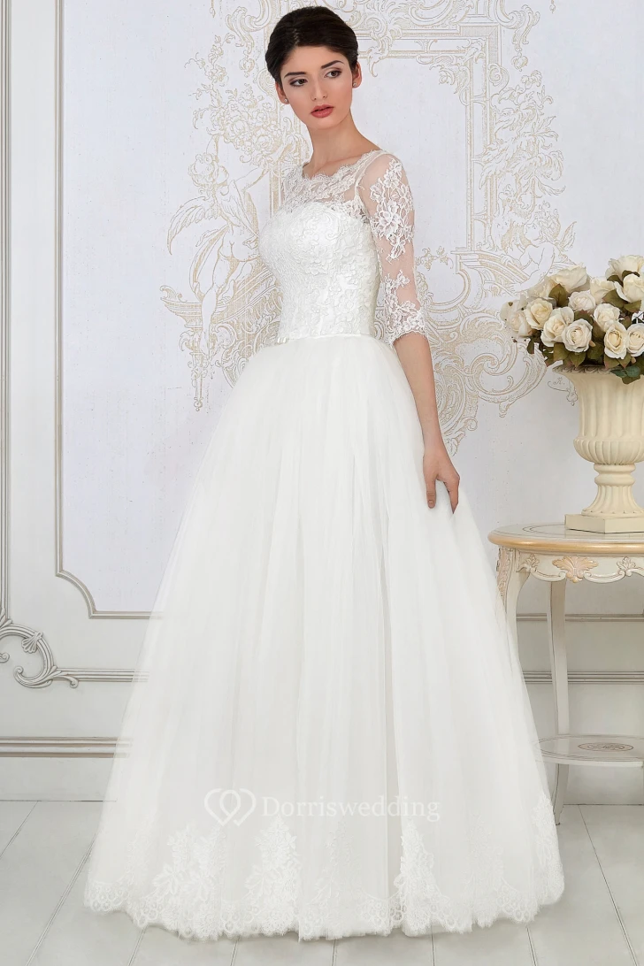 A-Line Scoop-Neck Half-Sleeve Tulle Wedding Dress With Lace Up