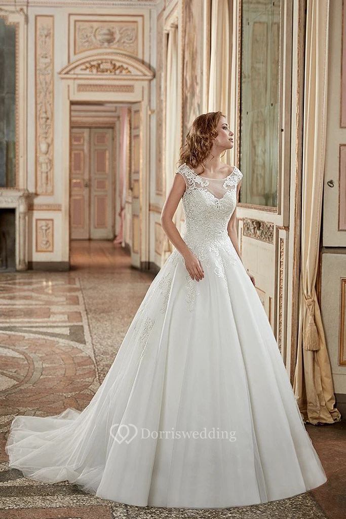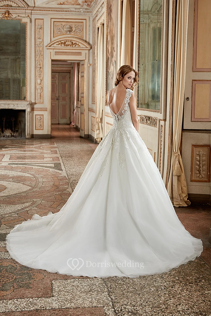 A-Line Scoop-Neck Long-Sleeveless Tulle Wedding Dress With Appliques And Deep-V Back