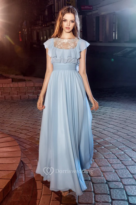 A-Line Scoop-Neck Poet-Sleeve Chiffon Illusion Dress With Lace And Draping