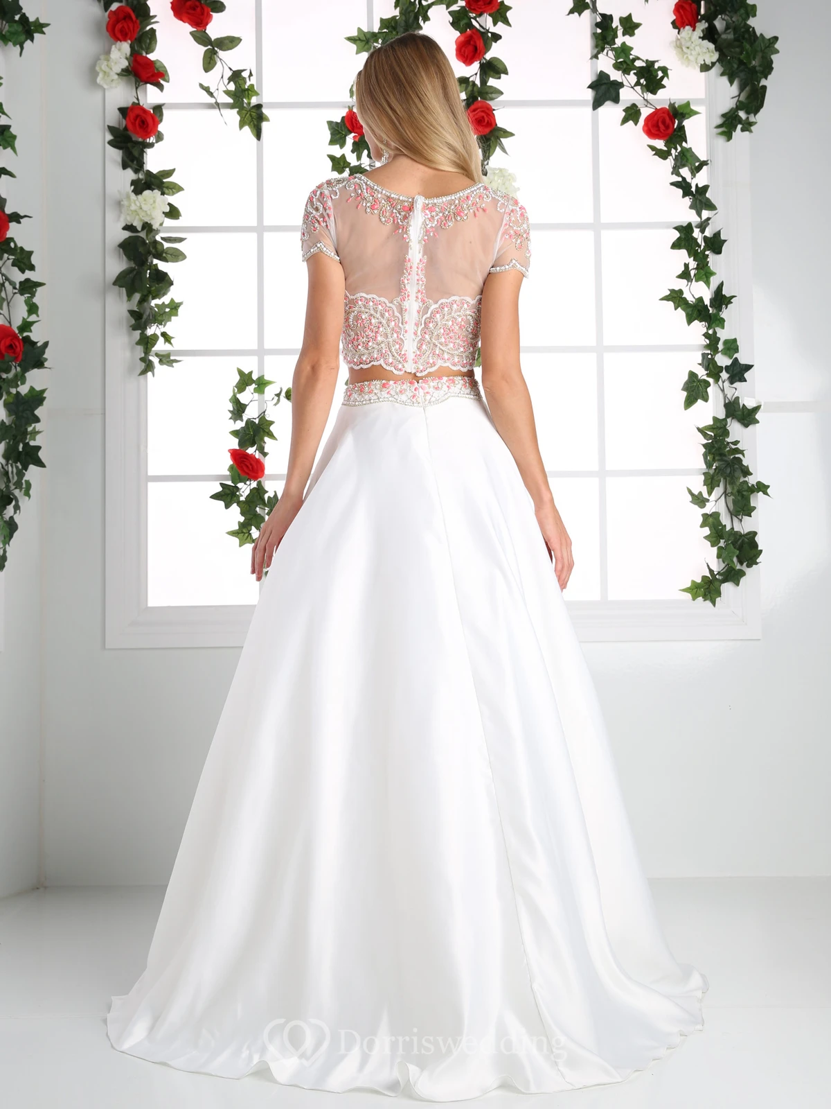 A-Line Scoop-Neck Short Sleeve Satin Illusion Dress With Beading