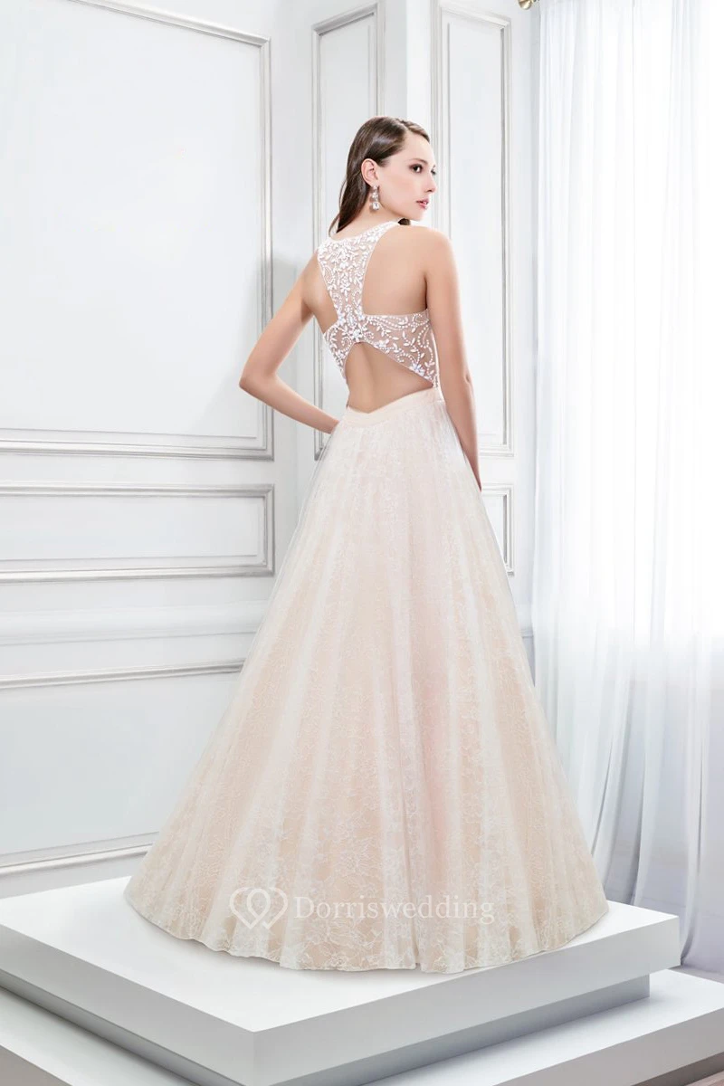 A-Line Scoop Neck Sleeveless Beaded Lace Prom Dress With Pleats