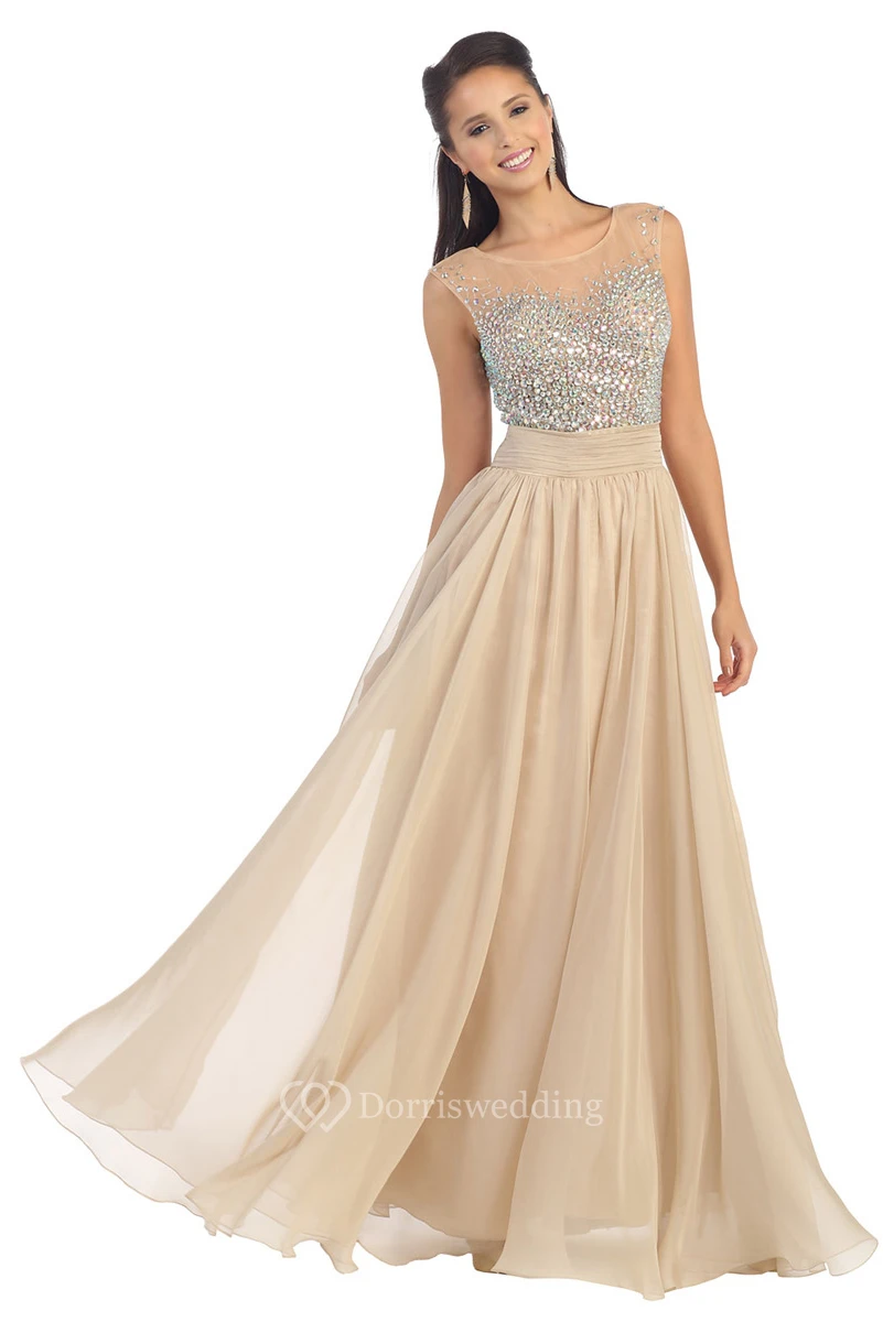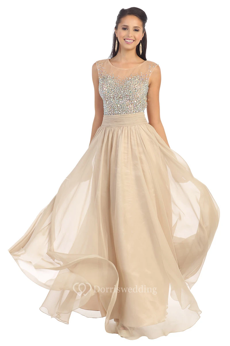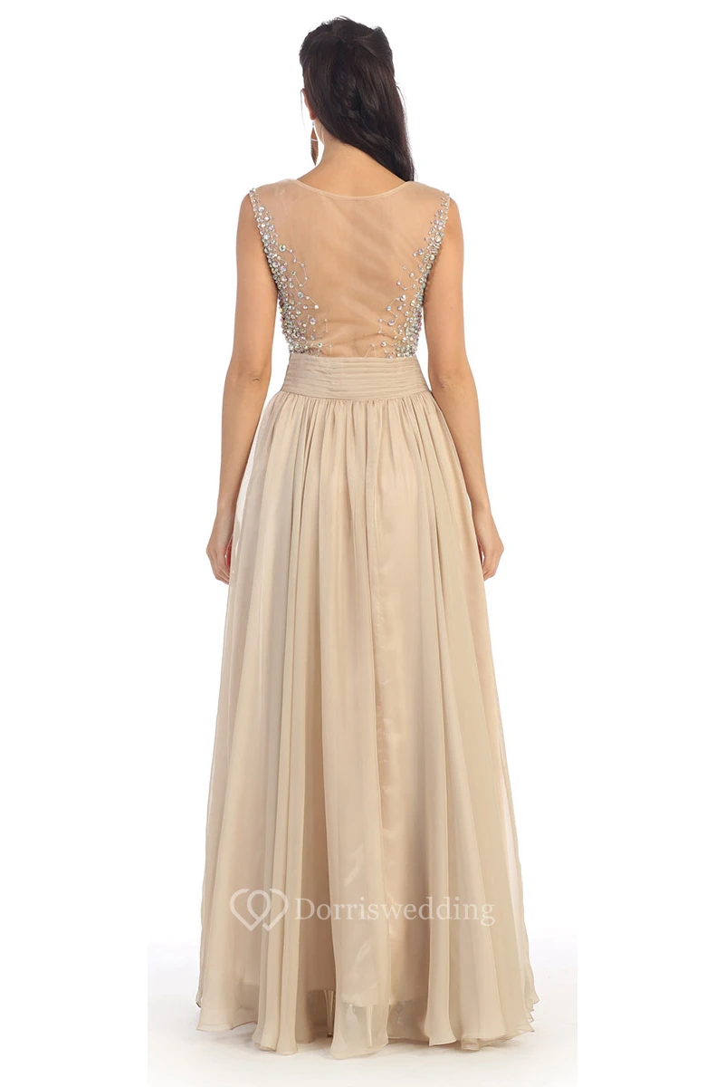 A-Line Scoop-Neck Sleeveless Chiffon Illusion Dress With Beading And Pleats