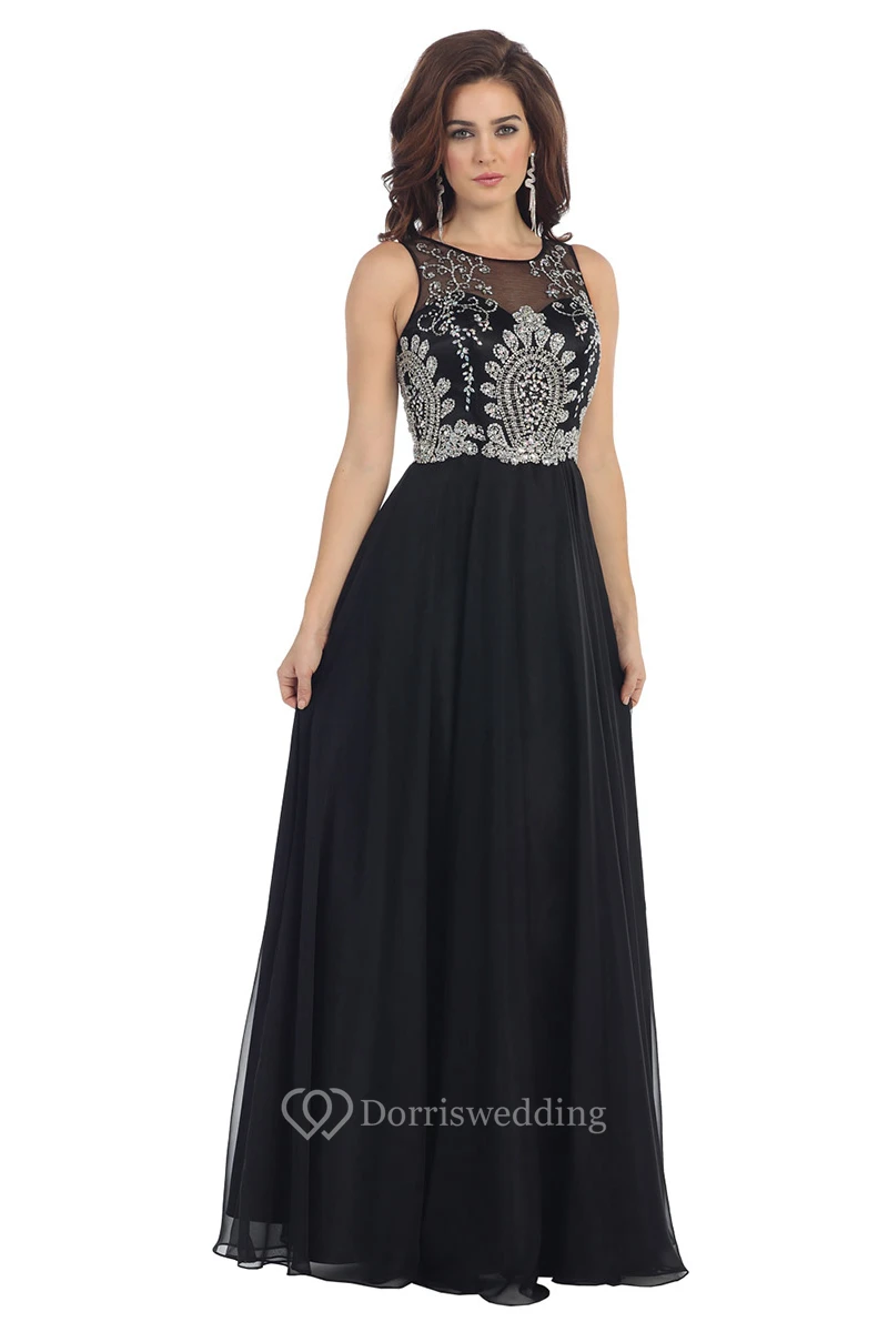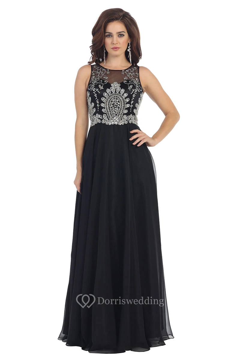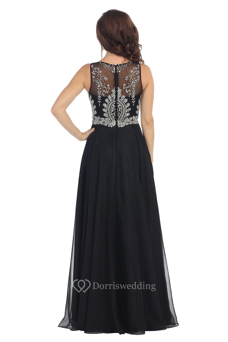 A-Line Scoop-Neck Sleeveless Chiffon Illusion Dress With Beading And Pleats