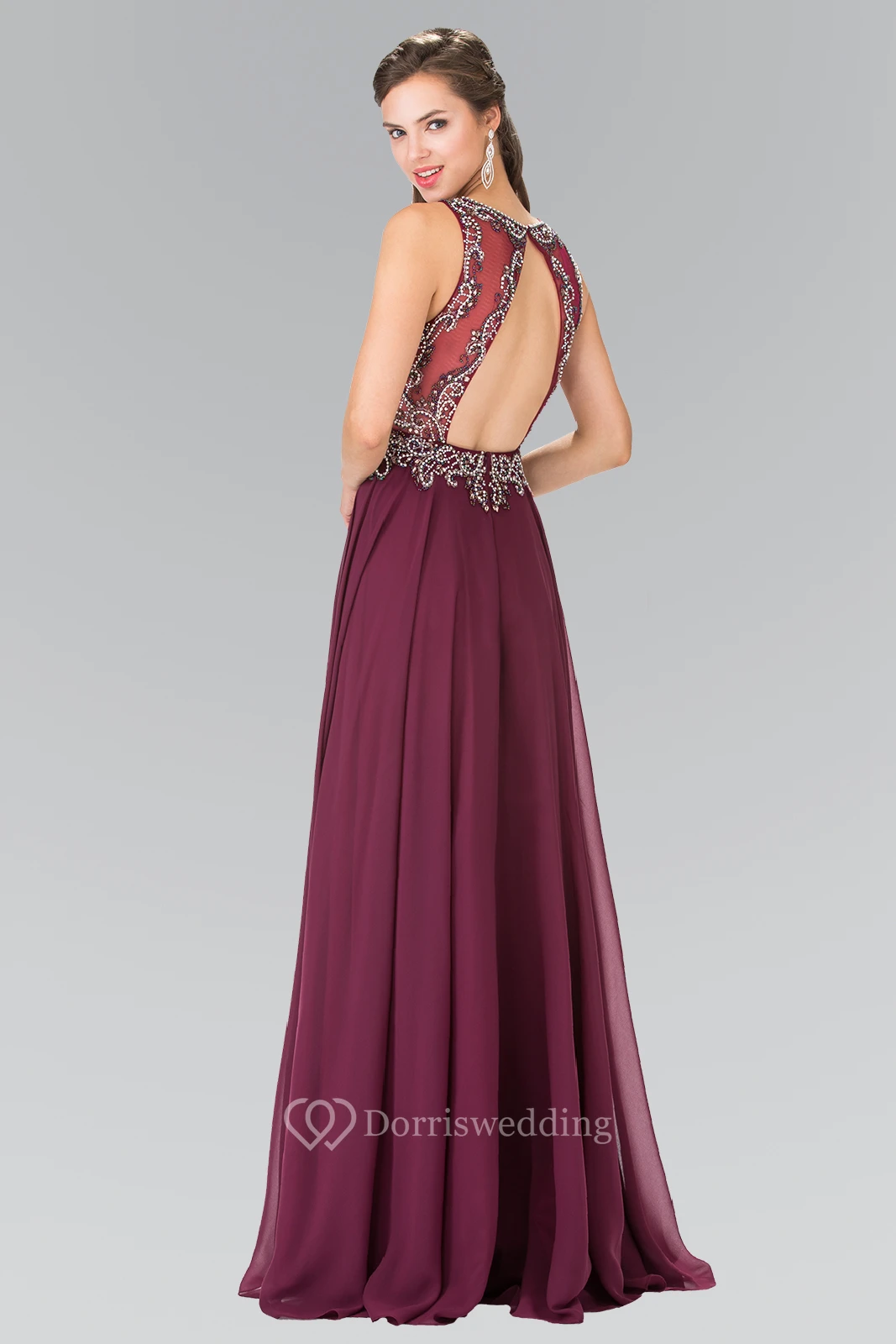 A-Line Scoop-Neck Sleeveless Chiffon Keyhole Dress With Beading And Pleats
