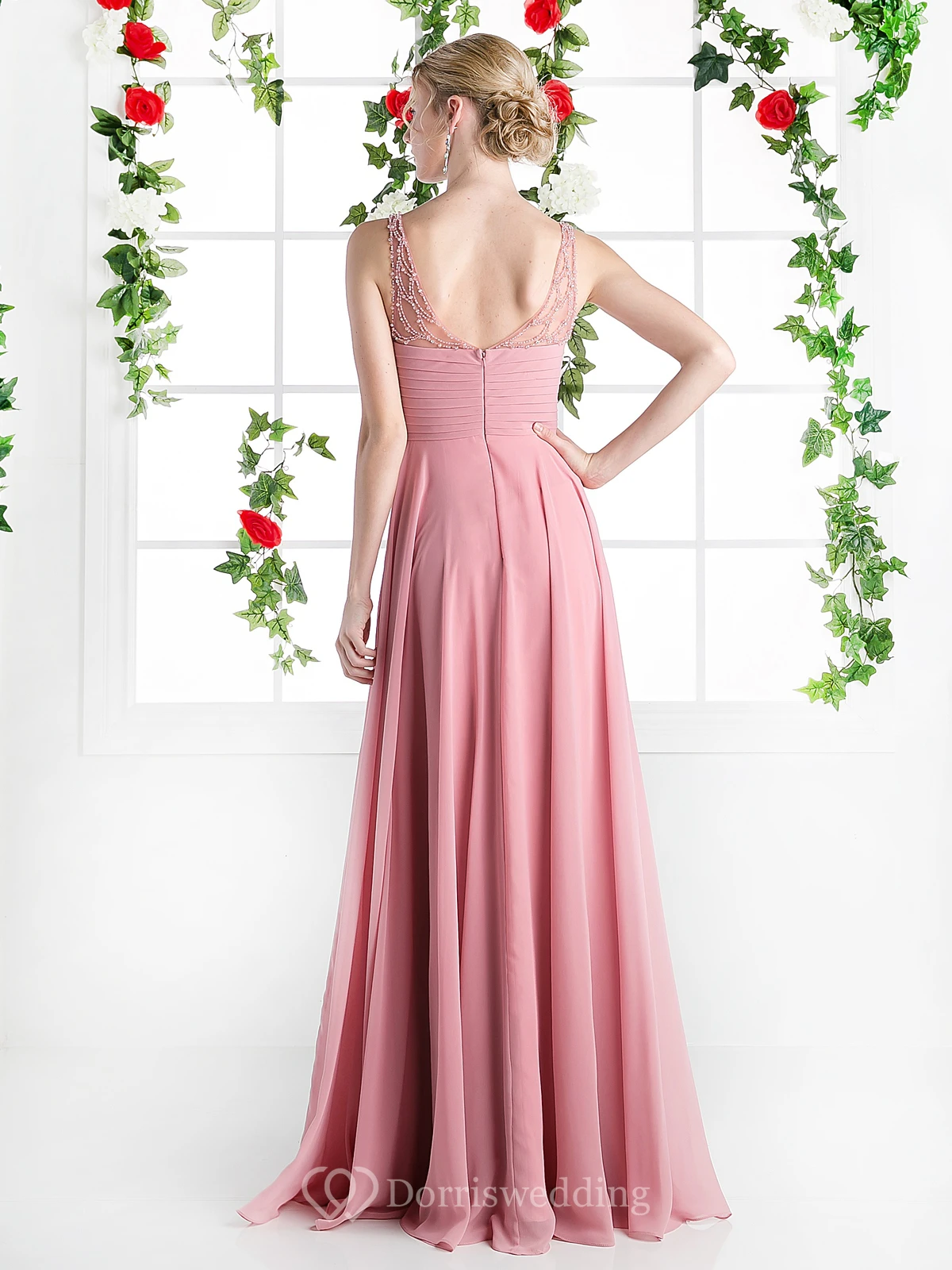 A-Line Scoop-Neck Sleeveless Chiffon Low-V Back Dress With Beading And Ruching