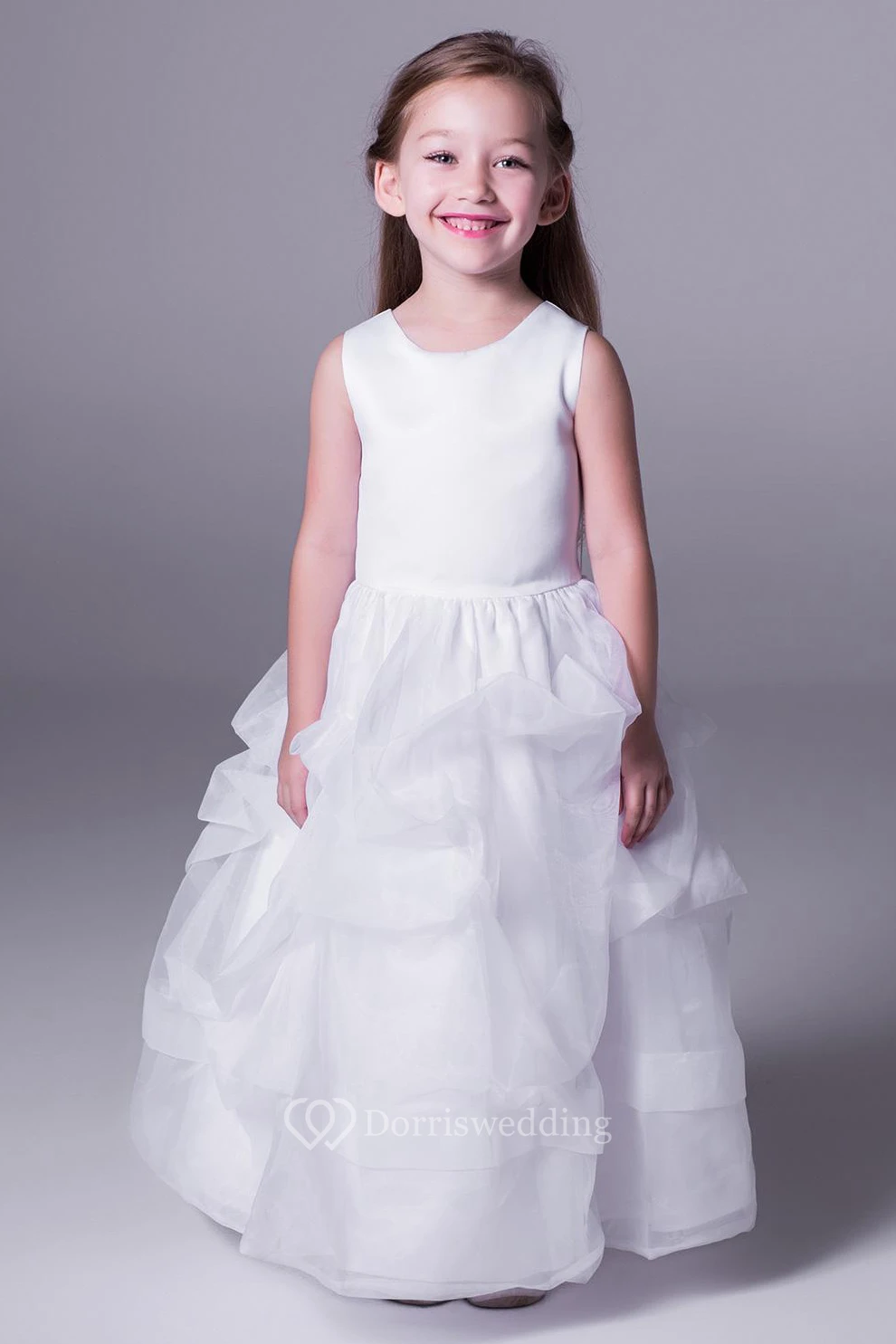 A-Line Scoop-Neck Sleeveless Floor-Length Pick-Up Satin Flower Girl Dress