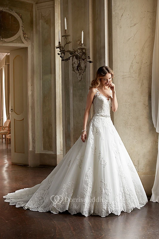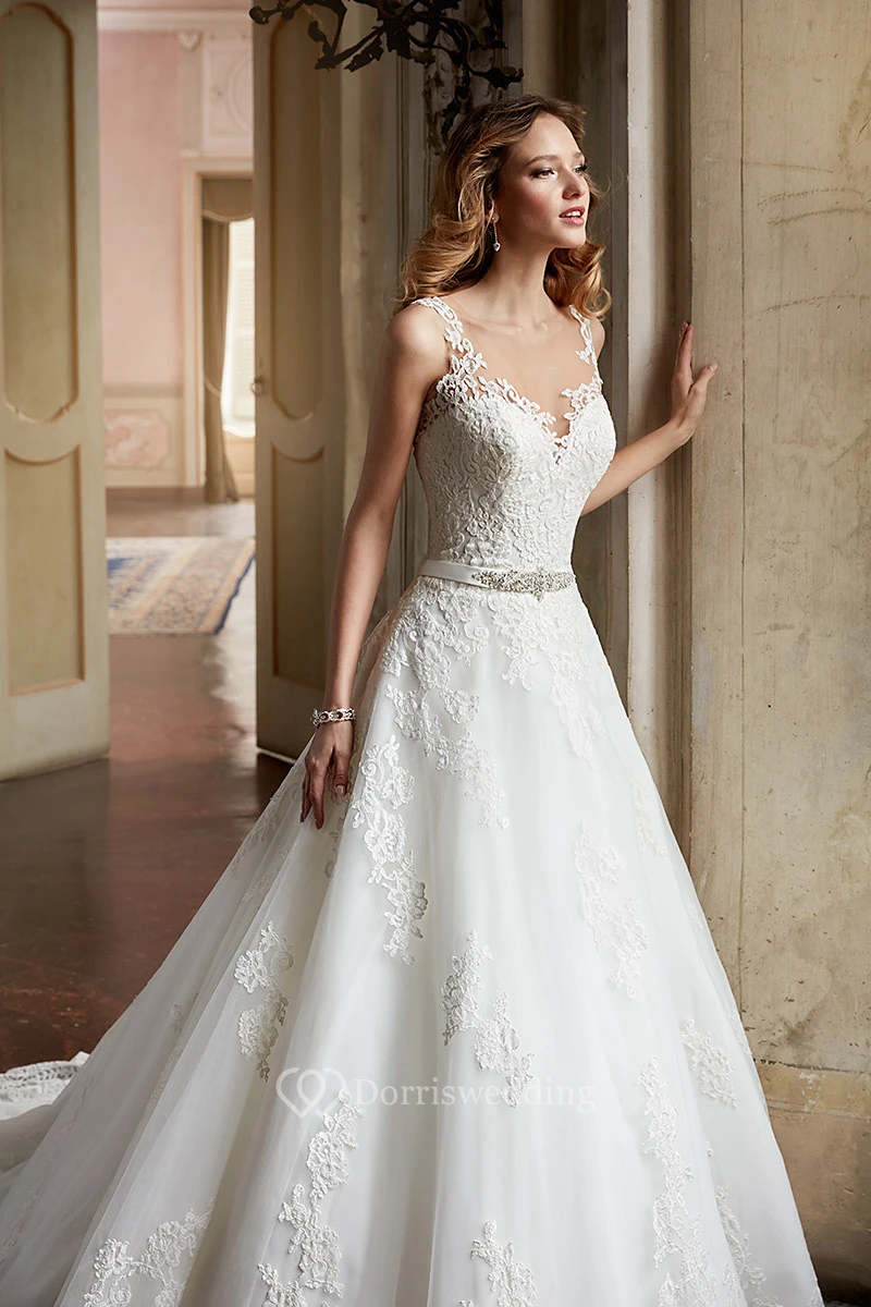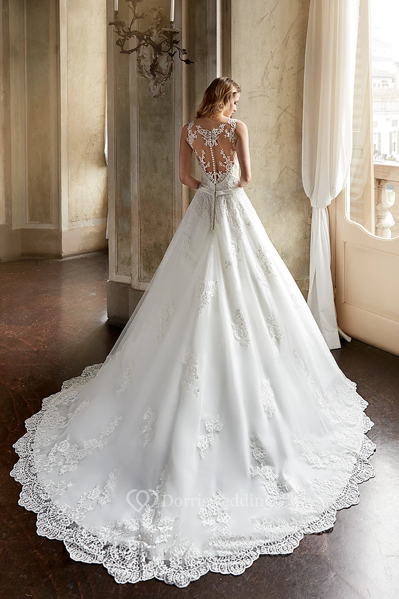 A-Line Scoop-Neck Sleeveless Maxi Appliqued Lace Wedding Dress With Waist Jewellery