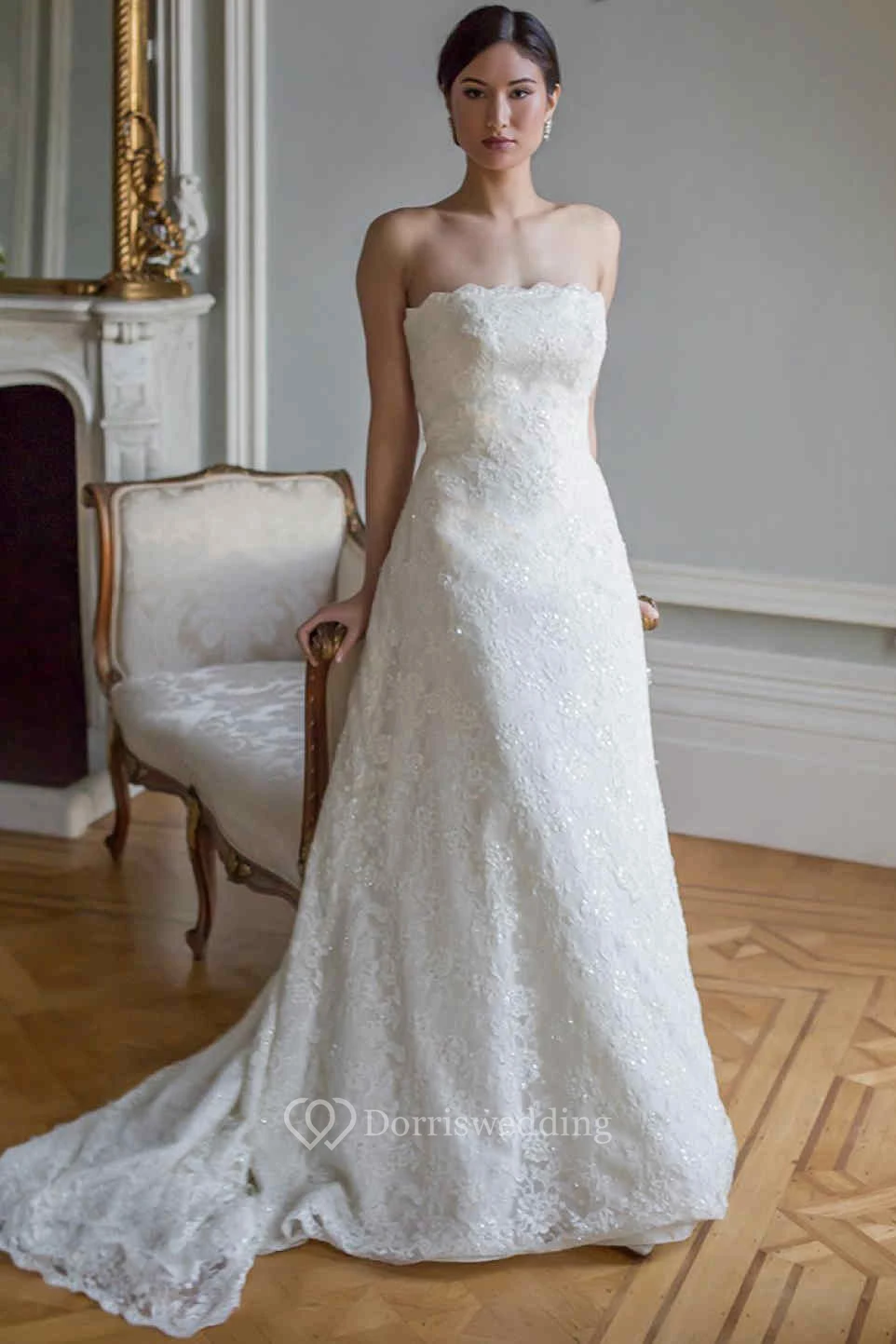 A-Line Sequined Floor-Length Strapless Lace Wedding Dress With Appliques And Court Train