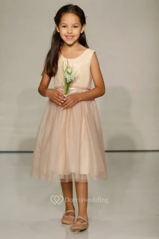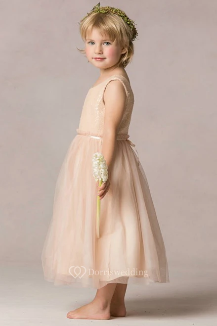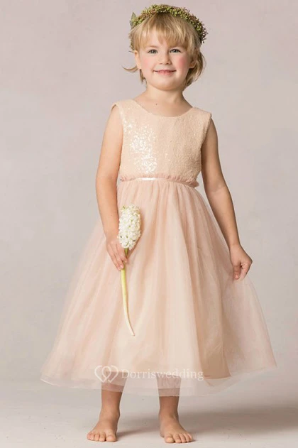 A-Line Sequined Scoop-Neck Tea-Length Sleeveless Tulle Flower Girl Dress
