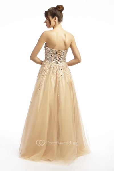 A-Line Sequined Sweetheart Long Sleeveless Tulle Prom Dress With Beading