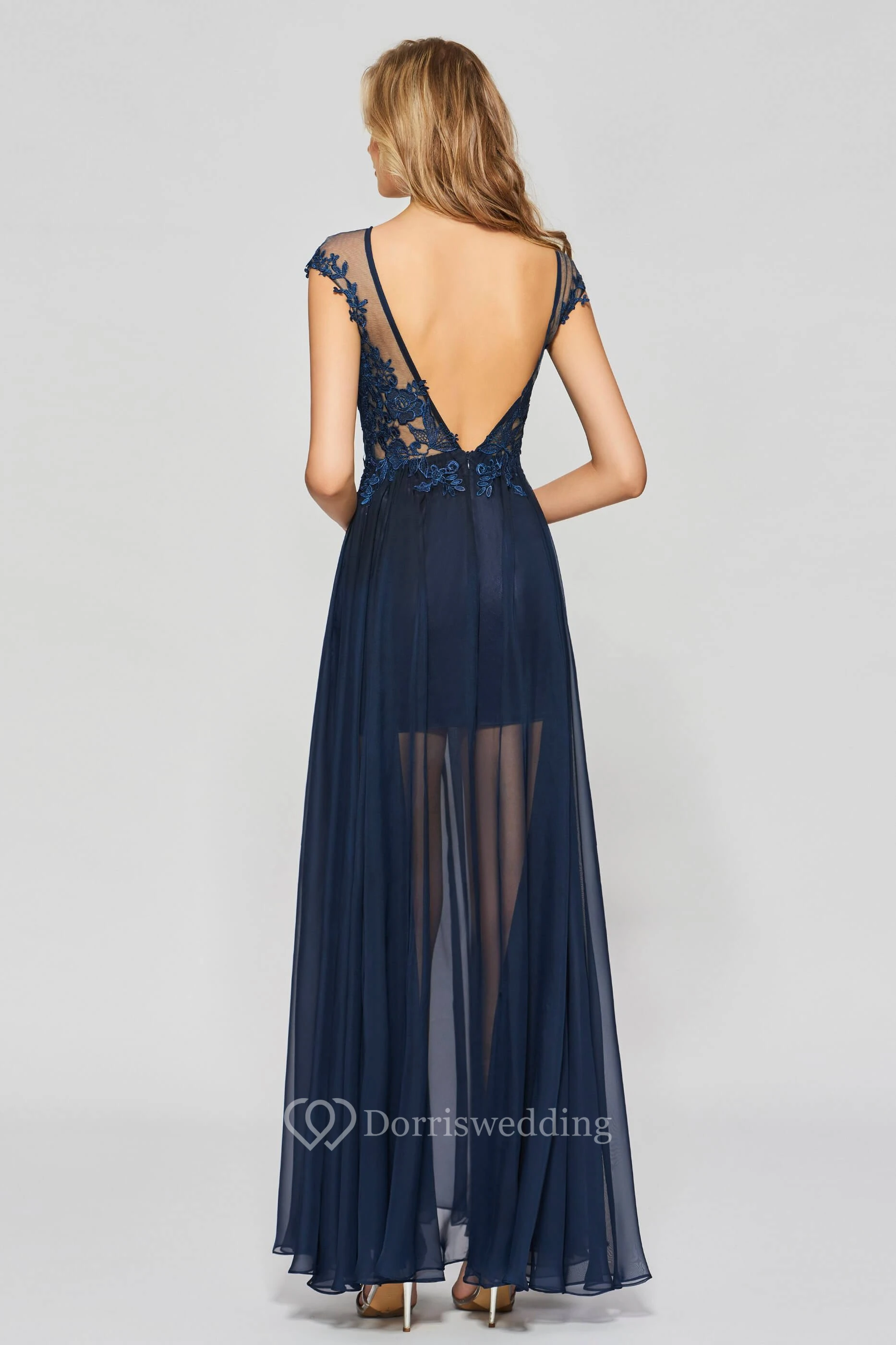 A-line Sexy Split Front Bateau Chiffon Gown With Lace Appliques And Deep V-back
