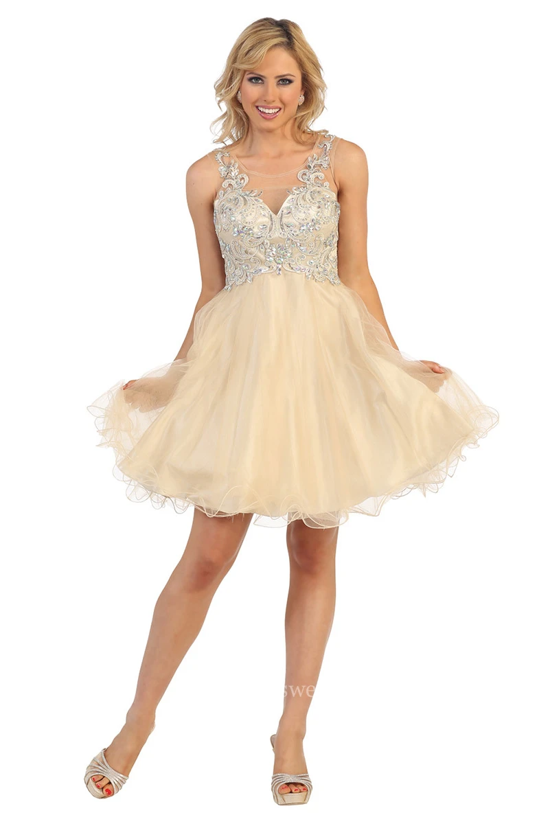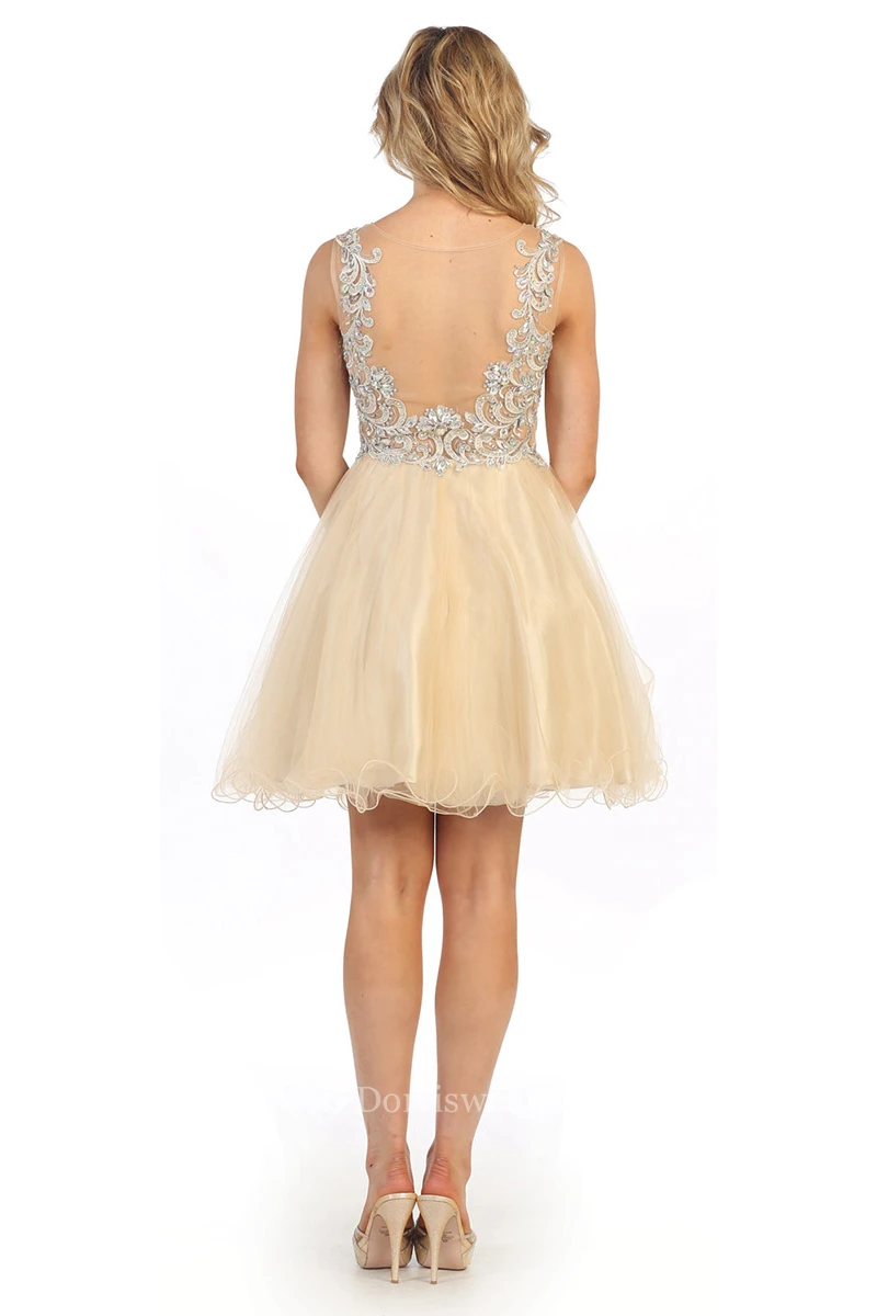 A-Line Short Bateau Empire Tulle Illusion Dress With Beading And Appliques