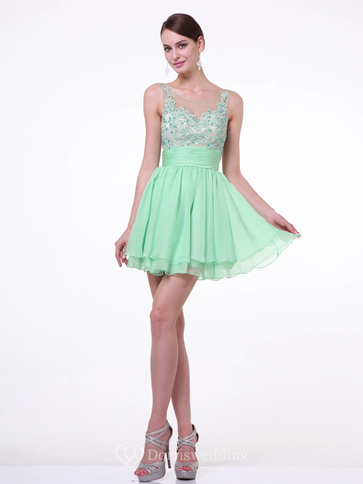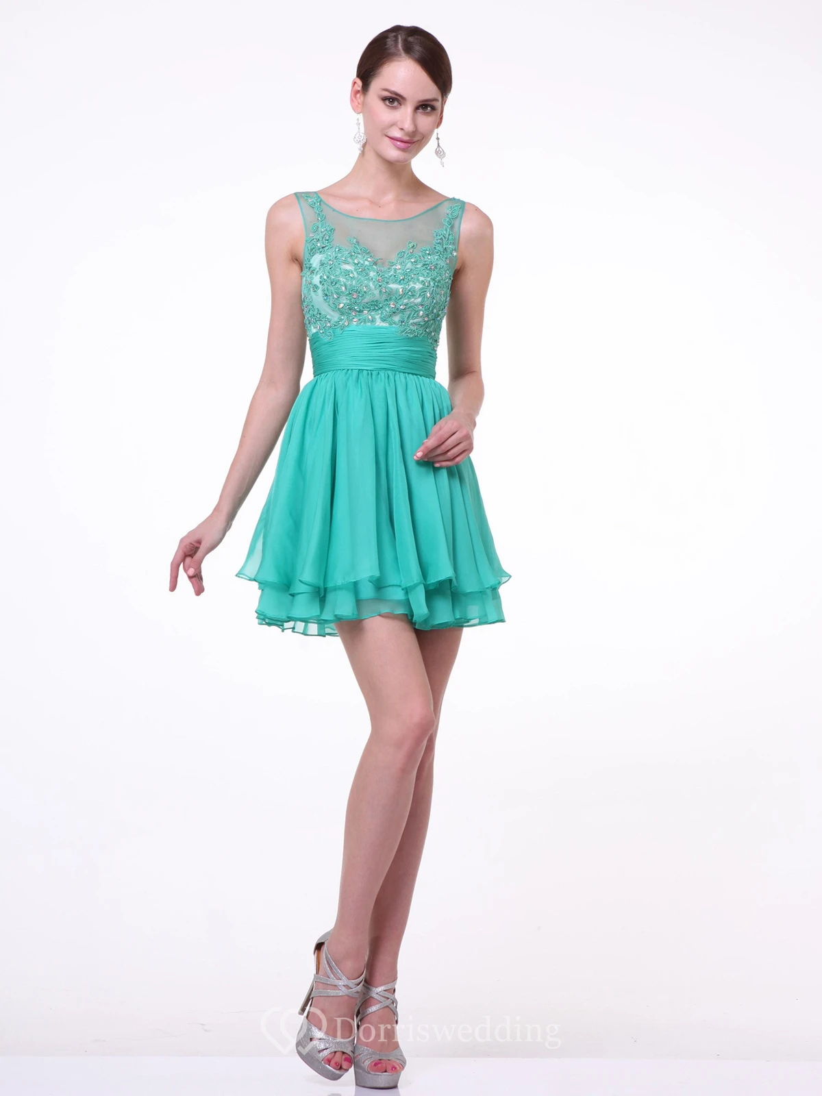A-Line Short Bateau Sleeveless Chiffon Dress With Appliques And Tiers
