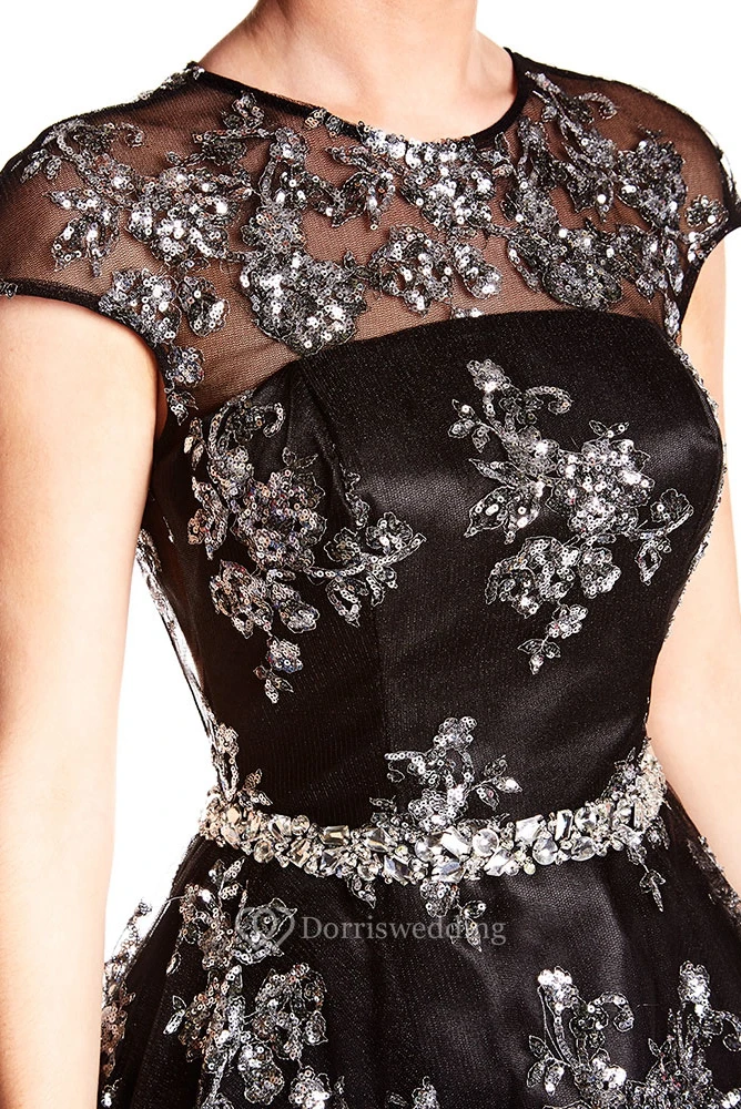 A-Line Short Beaded Jewel Cap-Sleeve Satin Prom Dress With Backless Style And Waist Jewellery