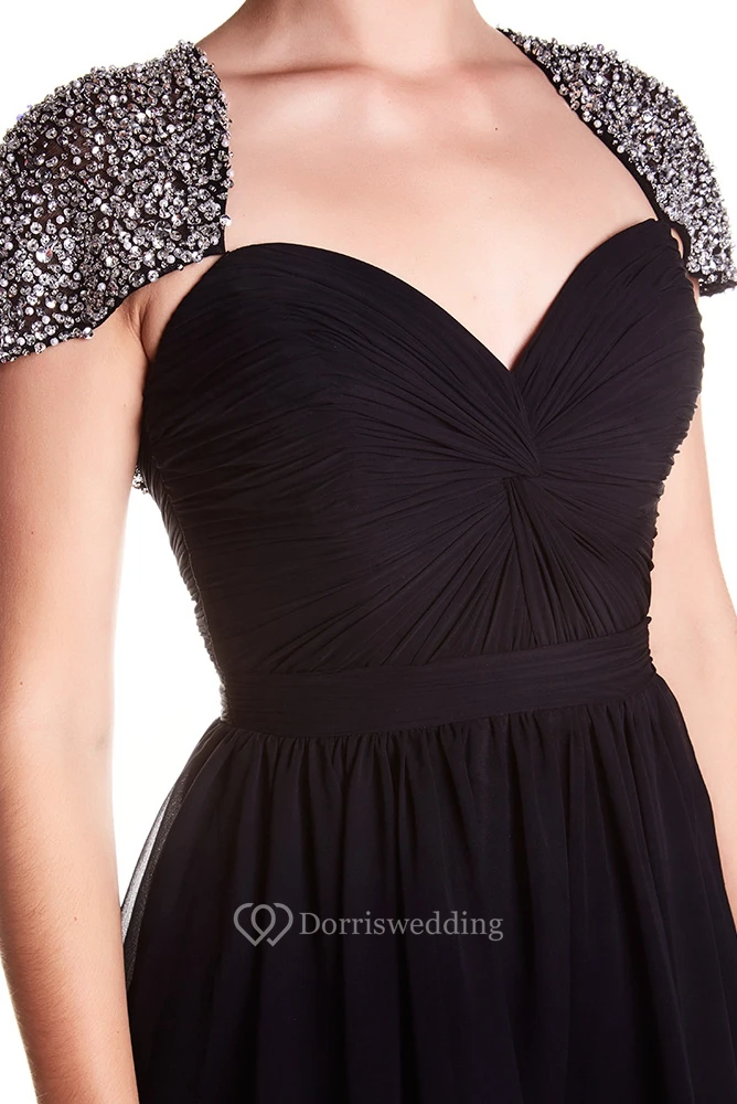 A-Line Short Cap-Sleeve Sweetheart Beaded Chiffon Prom Dress With Keyhole Back