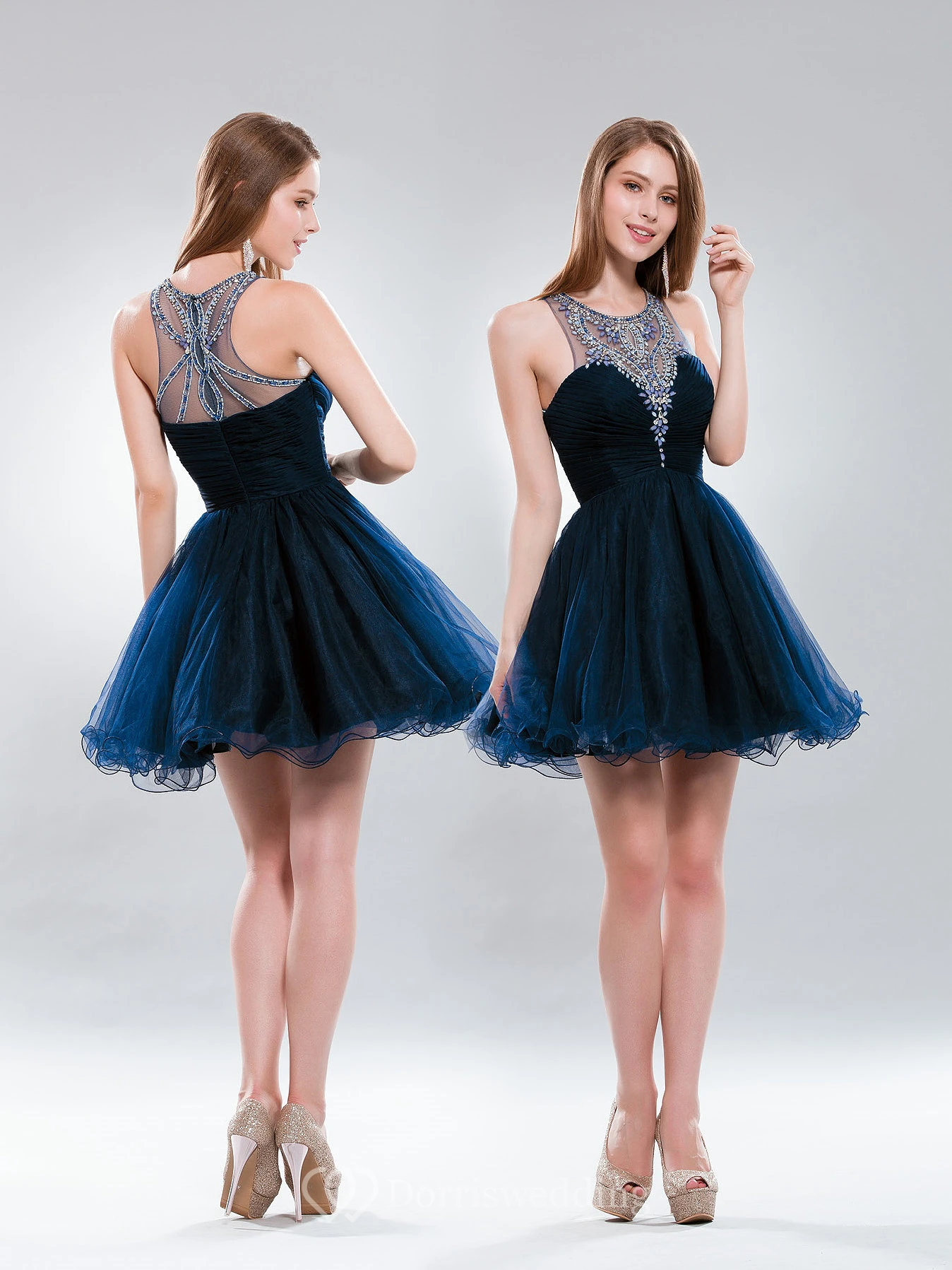A-Line Short High Neck Sleeveless Tulle Illusion Dress With Beading And Ruffles