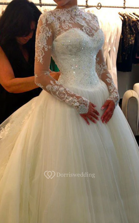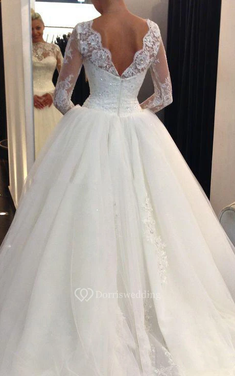 A-Line Short High Neck Sweetheart Long Sleeve Bell Poet Pleats Beading Appliques Court Train Backless Tulle Lace Dress