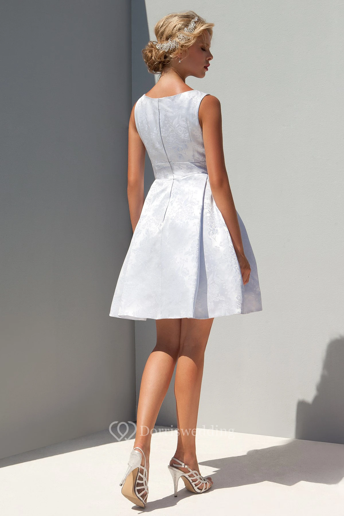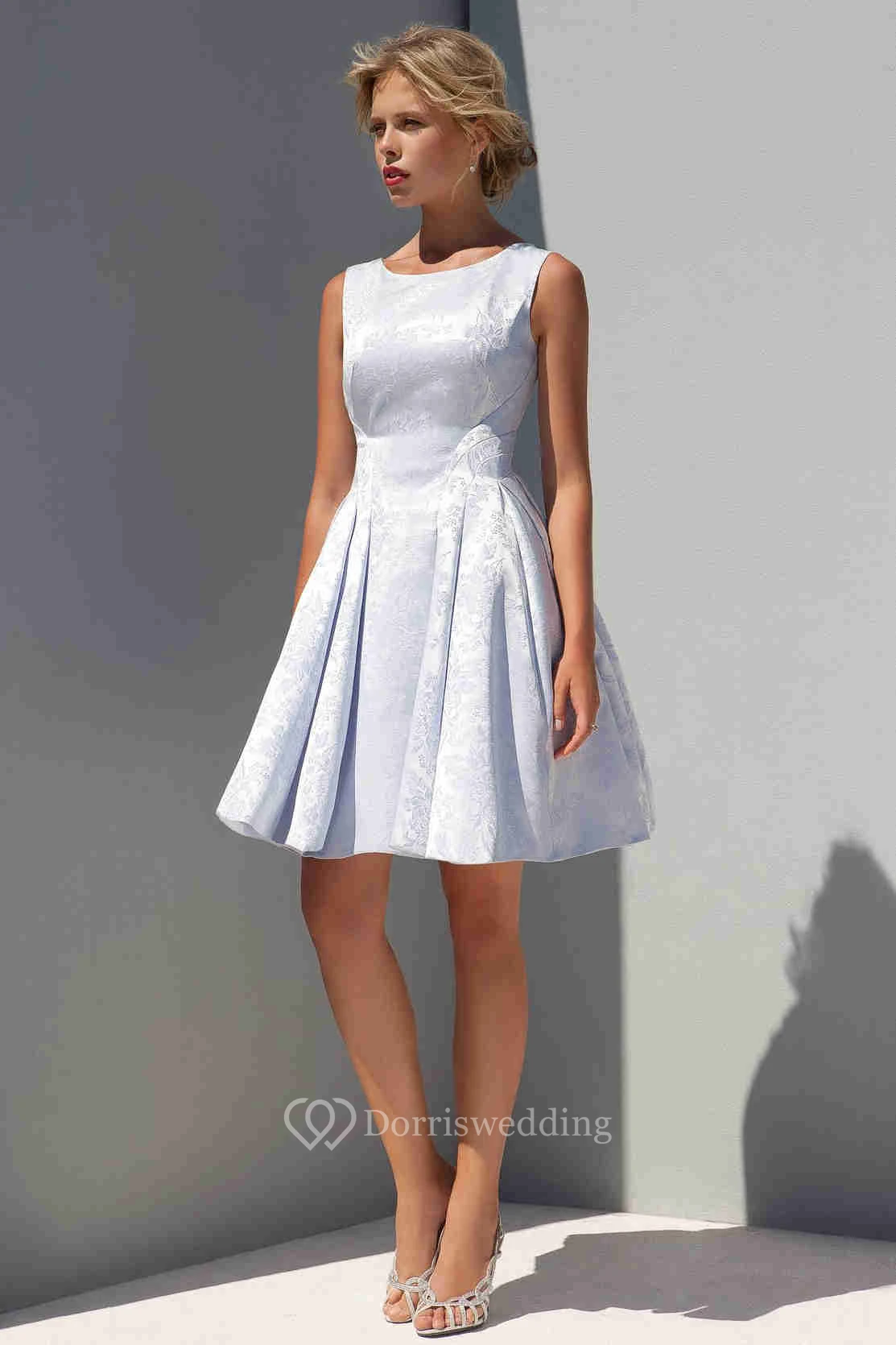 A Line Short Mini Scoop Neck Sleeveless Pleated Satin Wedding Dress