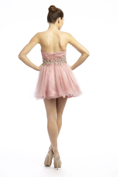 A Line Short Mini Sweetheart Sleeveless Beaded Tulle Prom Dress With Ruffles