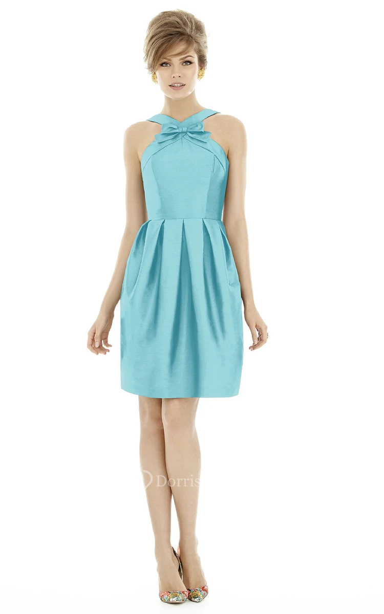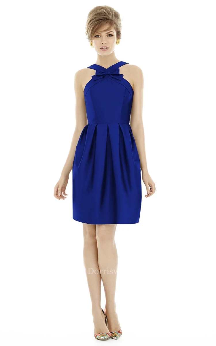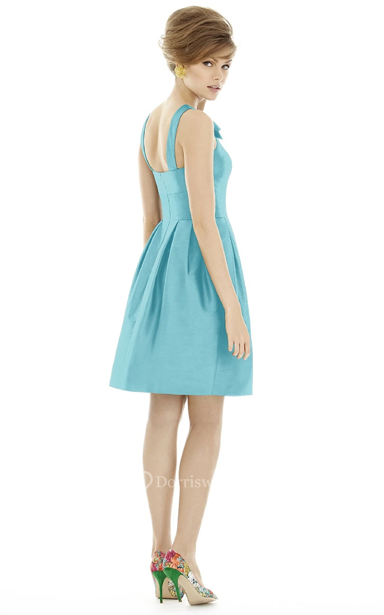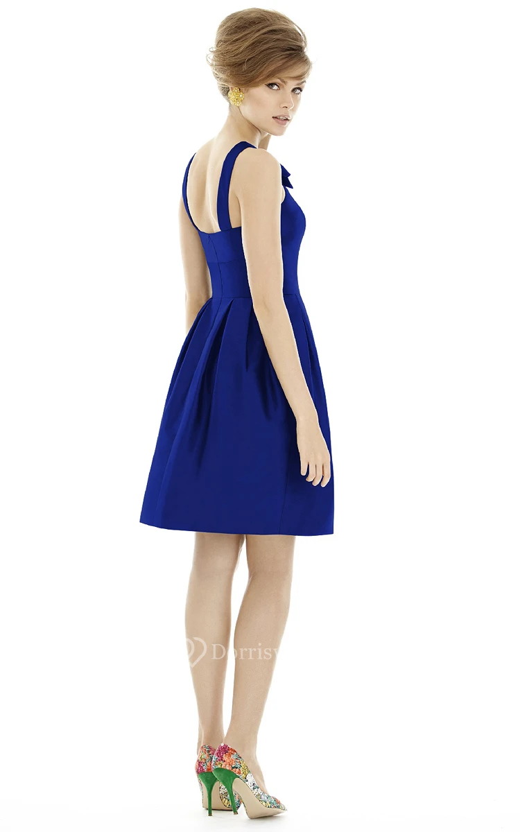 A-Line Short Ruched Satin Dress with Sash and Strap-Back