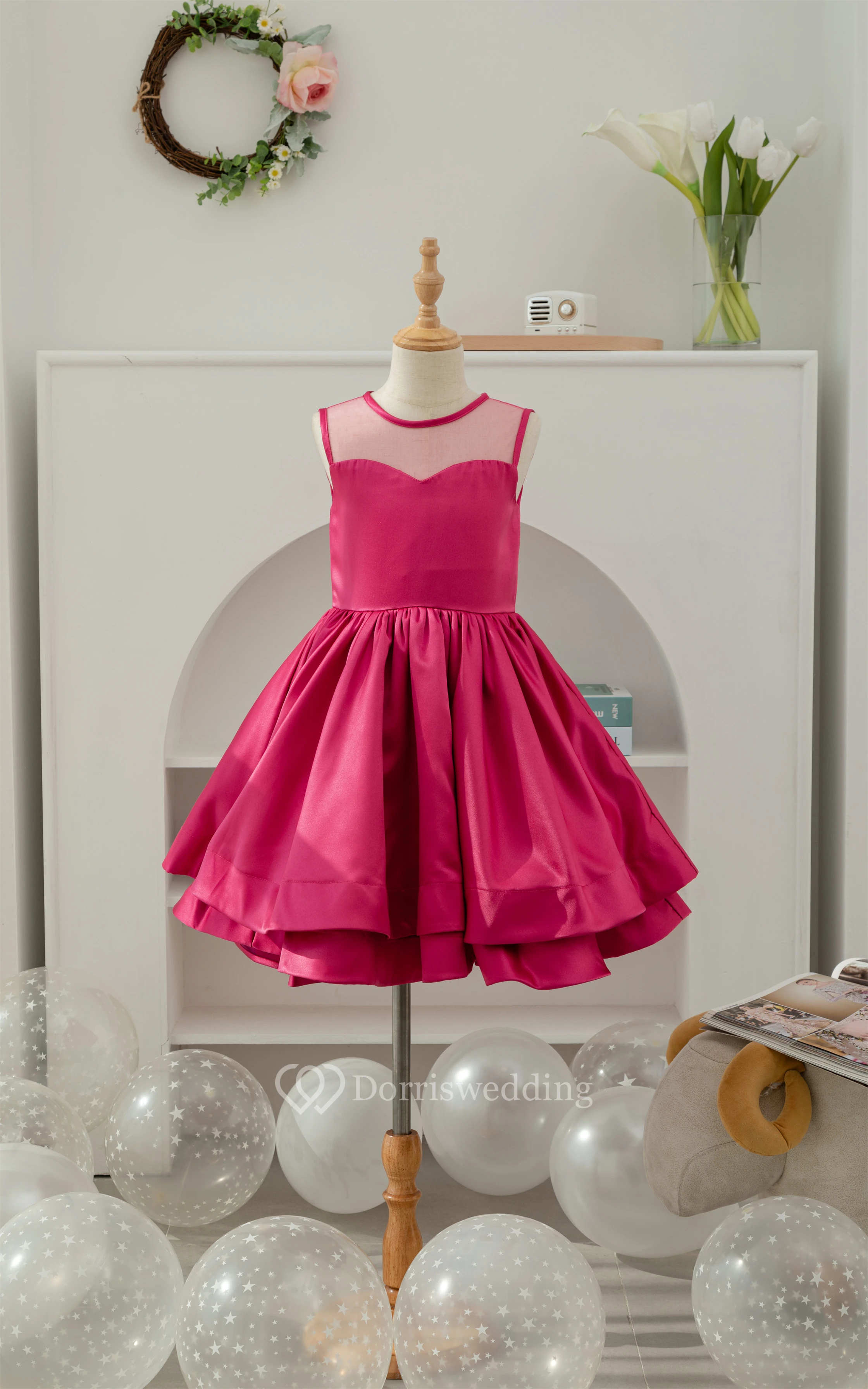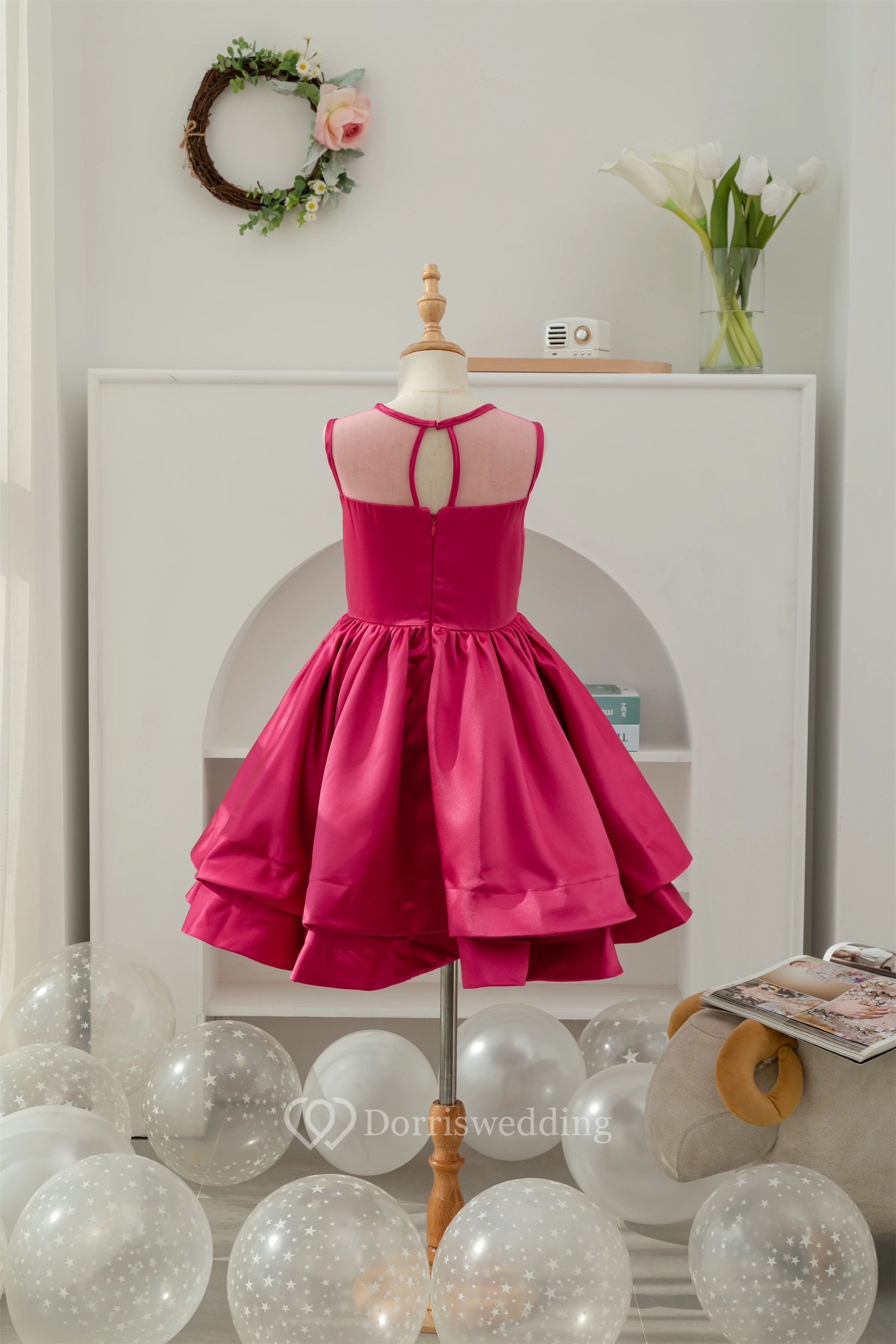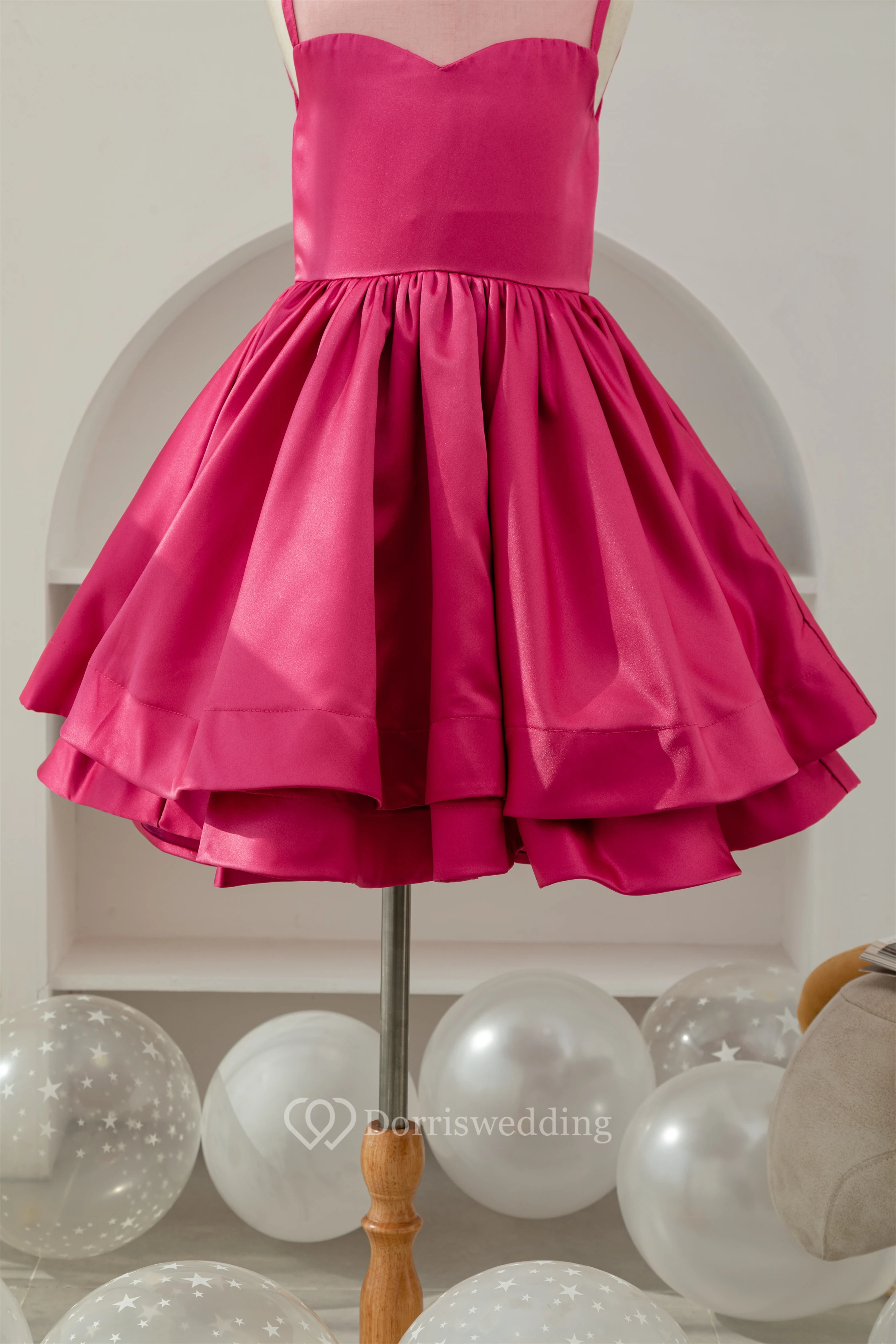 A-line Short Satin Layered Fuchsia Flowergirl Dress
