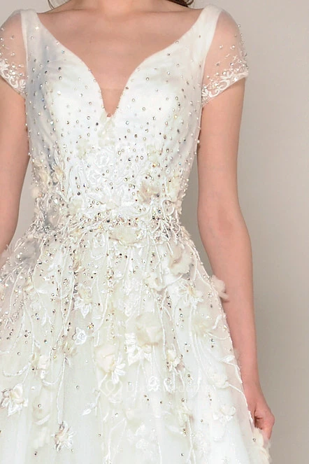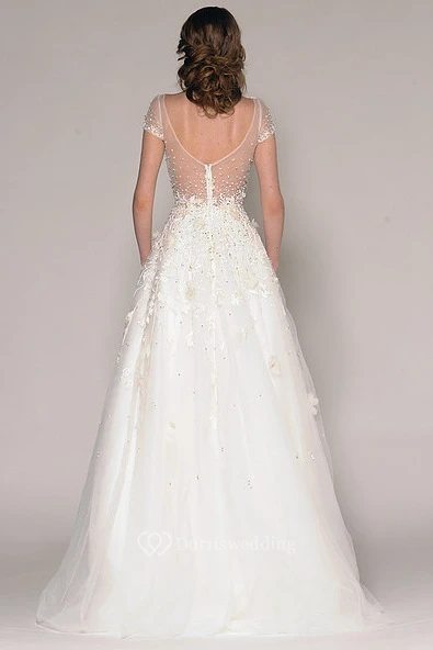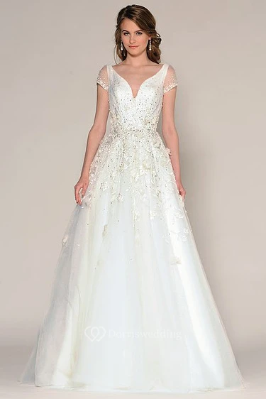 A-Line Short-Sleeve Beaded Floor-Length V-Neck Tulle Wedding Dress With Embroidery And Flower