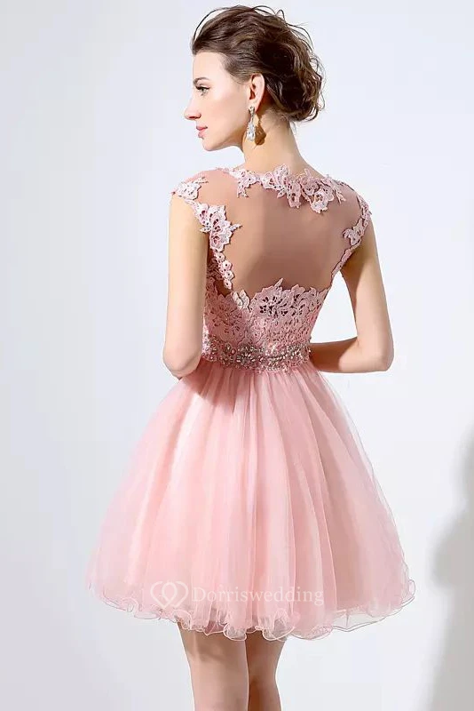 A-line Short Sleeve Lace Tulle Bateau Illusion Short Mini Homecoming Dress