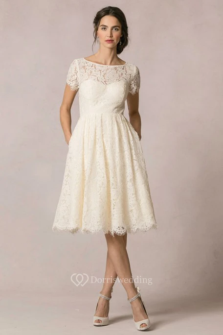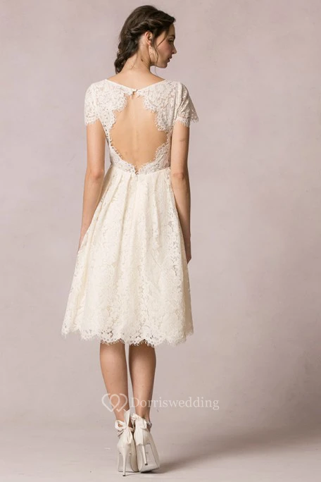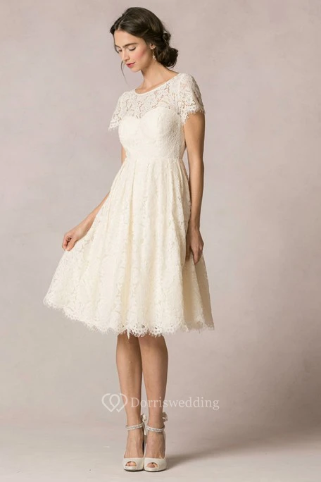 A-Line Short-Sleeve Scoop-Neck Short Lace Wedding Dress With Keyhole
