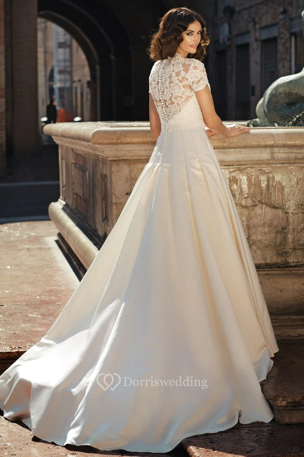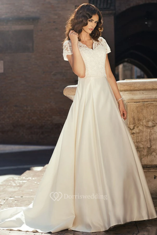 A-Line Short-Sleeve V-Neck Floor-Length Satin&Lace Wedding Dress